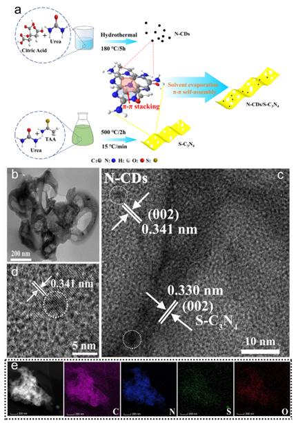 “Enhanced photocatalytic degradation andH2evolution performance of N-CDs/S-C3N4S-scheme heterojunction constructed by π-π conjugate self-assembly”為題發(fā)表在Journal of Materials Science & Technology上(IF=10.9,封面論文)。以提升光催化劑應(yīng)用場(chǎng)景和性能為目的,通過設(shè)計(jì)并組裝兩個(gè)具有匹配能帶結(jié)構(gòu)的半導(dǎo)體構(gòu)建異質(zhì)結(jié)的角度,工作四采用簡(jiǎn)單的溶劑蒸發(fā)法通過π-π共軛相互作用在硫摻雜氮化碳半導(dǎo)體表面自組裝氮摻雜碳點(diǎn),成功制備了一種新型的0D/2D S構(gòu)型異質(zhì)結(jié)雜化材料。實(shí)現(xiàn)了光催化降解和析氫性能雙向顯著增強(qiáng)。