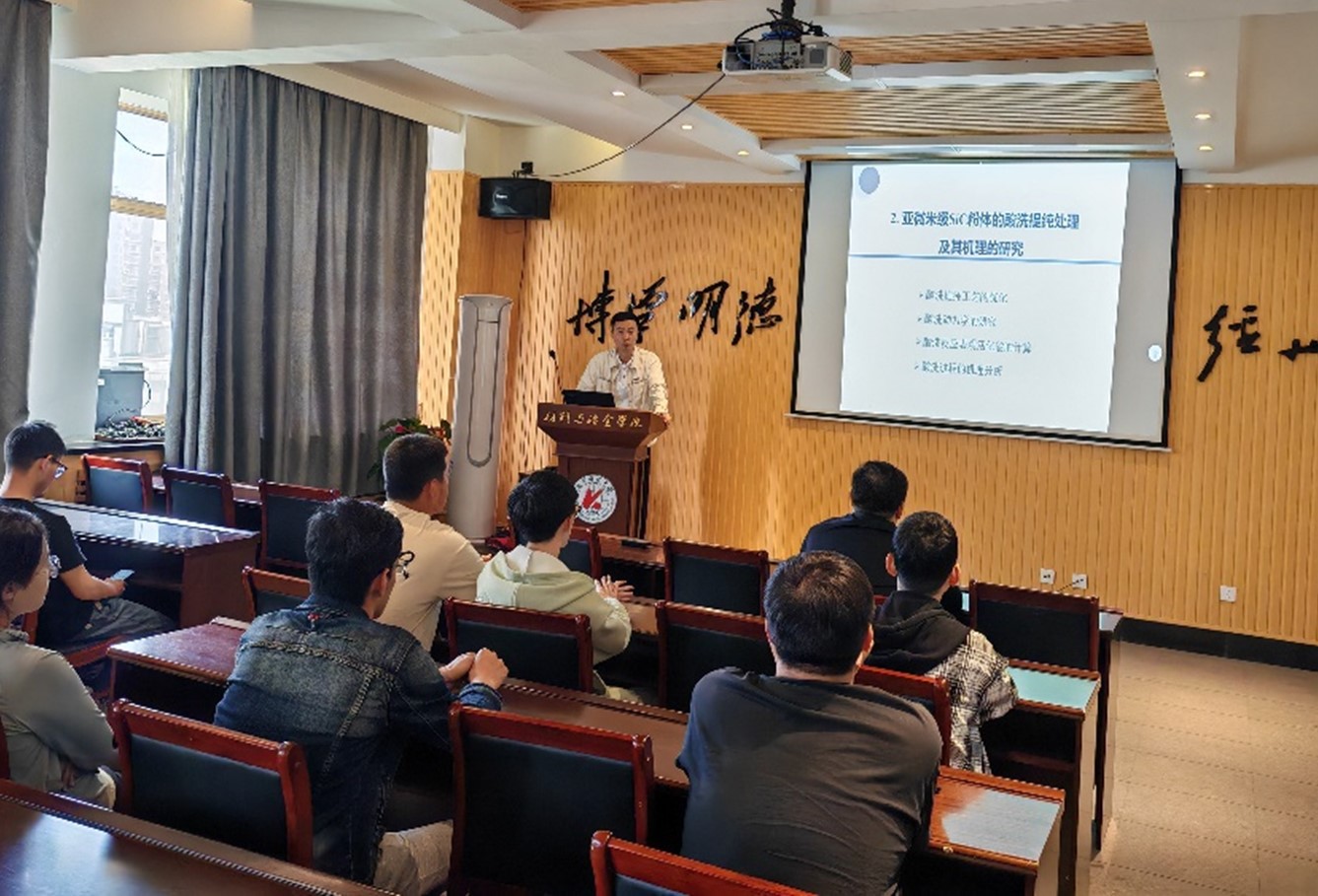 馮東教師報告主題為“無壓固相燒結SiC陶瓷原料提純、顯微組織和力學性能的研究”。主要分享了自己目前科研成果:其研究了SiC原料粉體中雜質的來源和賦存形態、亞微米級SiC粉體的提純處理及其純化機理、SiC粉體特性對陶瓷材料顯微組織和力學性能的影響規律,以獲得SiC原料粉體的高效除雜方法,探索原料組分設計對SiC陶瓷材料微觀組織與力學性能的影響機制,實現無壓固相燒結SiC結構陶瓷材料的性能提升。