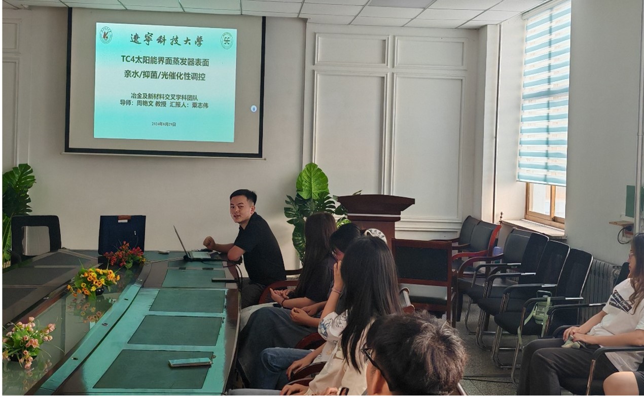 粟志偉博士報告主題為“TC4太陽能界面蒸發器表面的親水/抑菌/光催化性調控”,主要分享了自己目前的科研成果:在TC4鈦合金作為蒸發器基板上復合薄膜,探究在金屬基太陽能界面蒸發器表面使用磁控濺射復合TiO2功能性薄膜的可行性及工藝穩定性。同時探討了復合表面在實際應用環境中的親水時效,抗生物污損性。