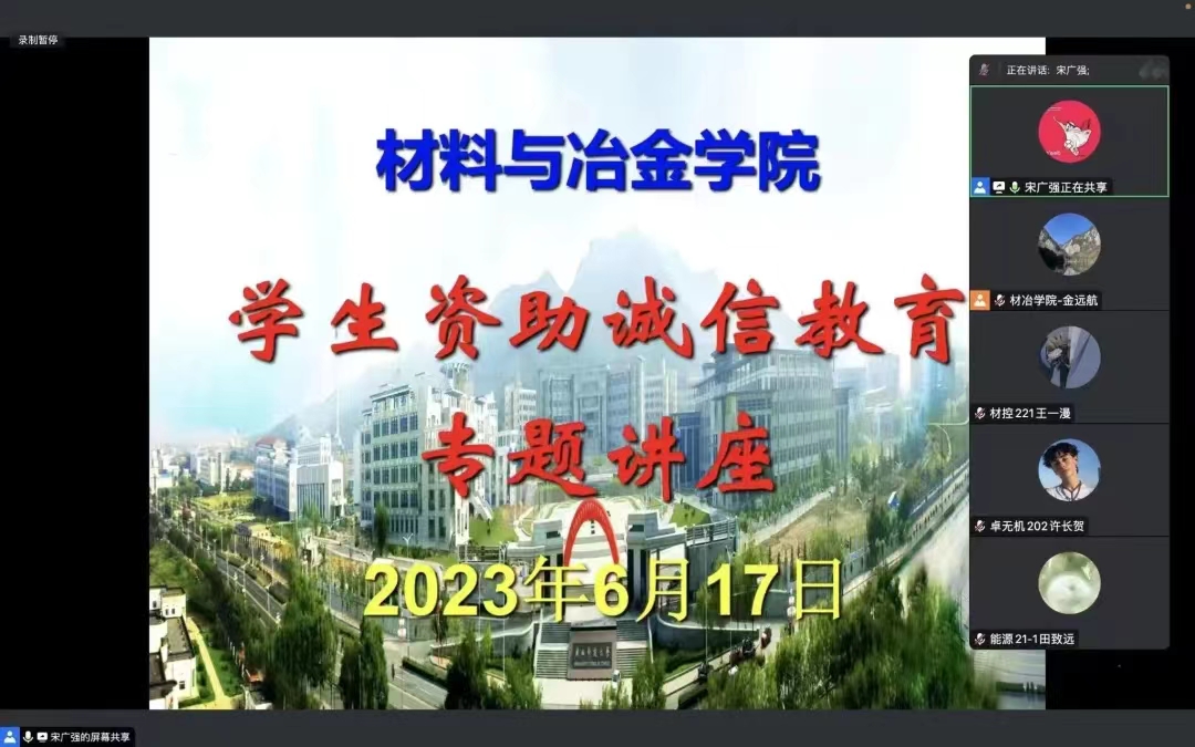 6月17日晚,材料與冶金學院舉辦學生資助誠信教育專題講座,材料與冶金學院全體本科生收聽講座,講座由學院輔導員宋廣強副教授主講。
