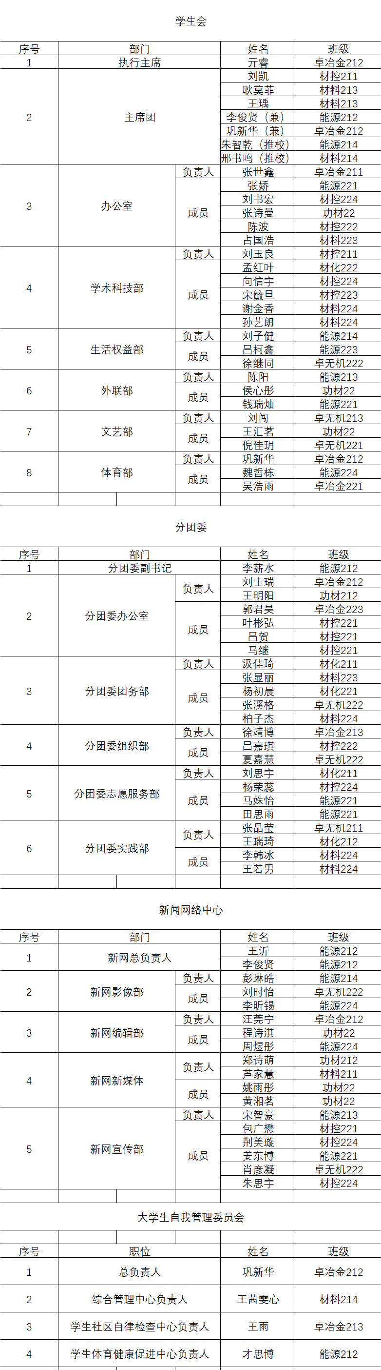 為進一步加強學院學生管理工作建設、增強學生組織的凝聚力和向心力、督促學生自我勉勵、創造更好的學院氛圍,擬定亓睿等77名同學為遼寧科技大學材料與冶金學院第十四屆團委、學生會、新聞網絡中心、自我管理委員會成員。