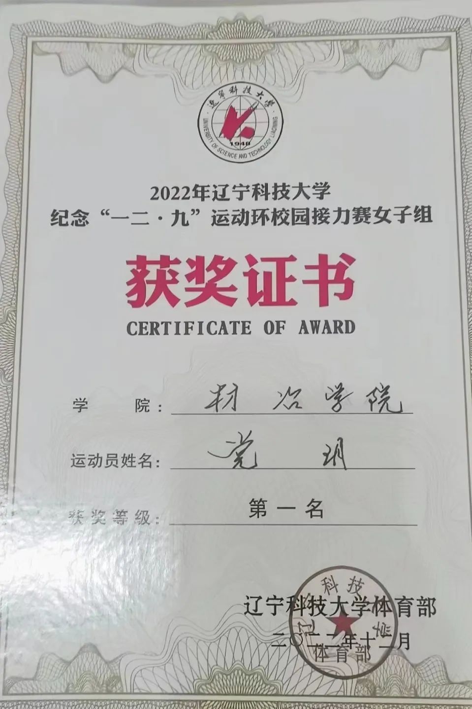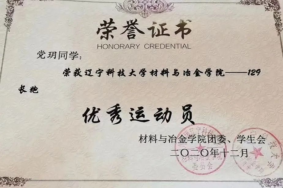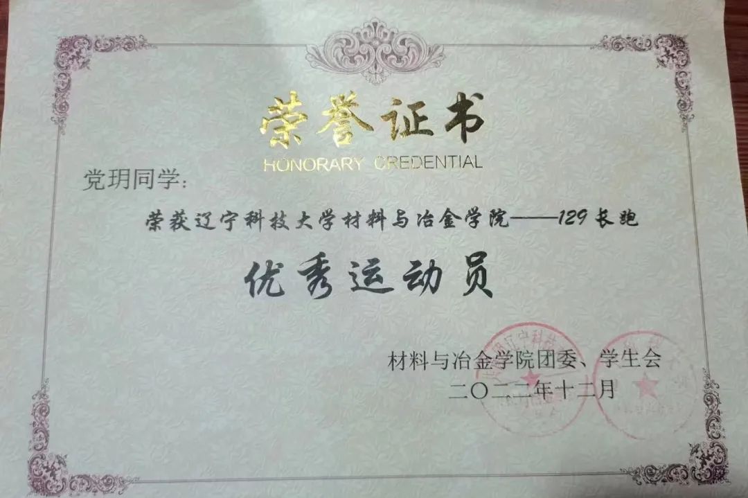 2023學(xué)年:第五十一屆運動會400米第一名、200米第二名 、4*100米第二名、10*400米第一名、遼寧省大學(xué)生田徑比賽400米第六名、200米第七名、4*100米第三名、4*400米第一名