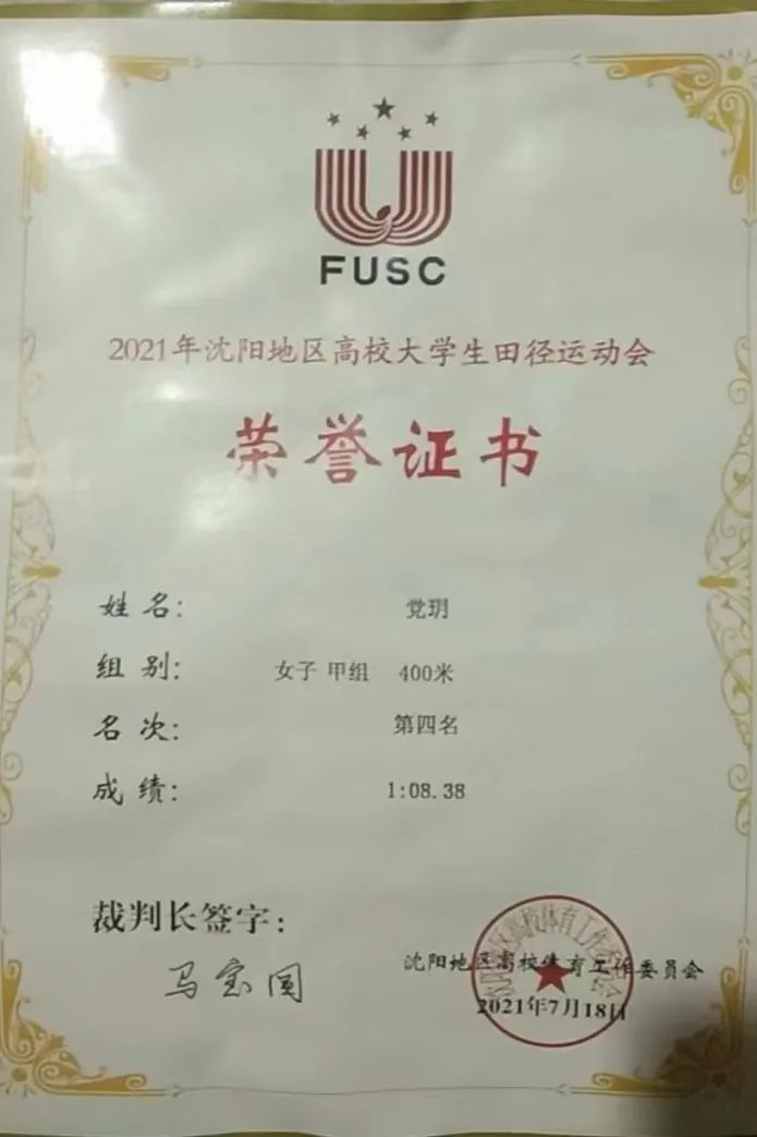 2021學(xué)年:第五十屆運動會400米第一名、200米第四名、 10*400第二名、4*100第四名、沈陽地區(qū)高校大學(xué)生田徑運動會400米第四名、200米第六名 、4*100米第一名、4*400米第二名、129環(huán)校園接力賽第二名