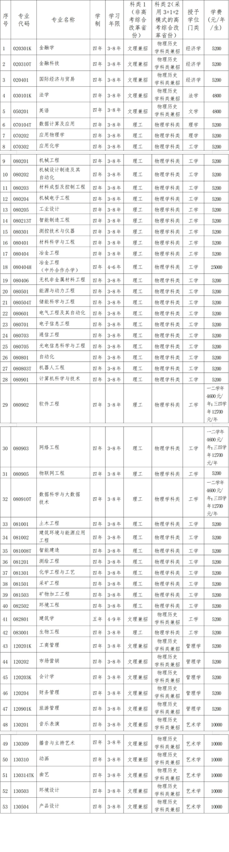數據科學與大數據技術、數據計算及應用、計算機科學與技術、軟件工程、網絡工程、物聯網工程、測繪工程、國際經濟與貿易、金融科技、動畫、環境設計、產品設計、冶金工程(中外合作辦學)專業,入學后學校公共外語課程原則只安排英語教學,其他語種考生慎重報考。