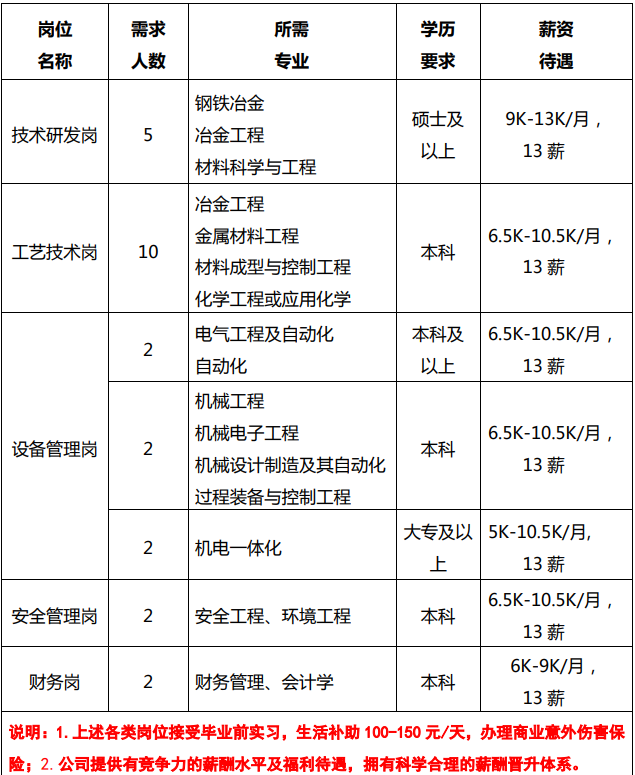 1、五險(xiǎn)一金及補(bǔ)充醫(yī)療互助:公司繳納養(yǎng)老、醫(yī)療、工傷、生育、失業(yè) 保險(xiǎn)以及住房公積金,其中公積金繳存比例合計(jì) 18%,工會(huì)另行購買住院 醫(yī)療互助,解決醫(yī)療后顧之憂; 2、免費(fèi)住宿:可入住公司人才公寓,空調(diào)、熱水器、電視機(jī)等一應(yīng)俱全; 3、健康體檢:每年免費(fèi)福利性體檢; 4、高溫補(bǔ)貼:每年 6-9 月發(fā)放高溫補(bǔ)貼; 5、其他福利:帶薪年休假、帶薪旅游、節(jié)日實(shí)物發(fā)放、每月超市福利卡、 子女教育補(bǔ)貼等。