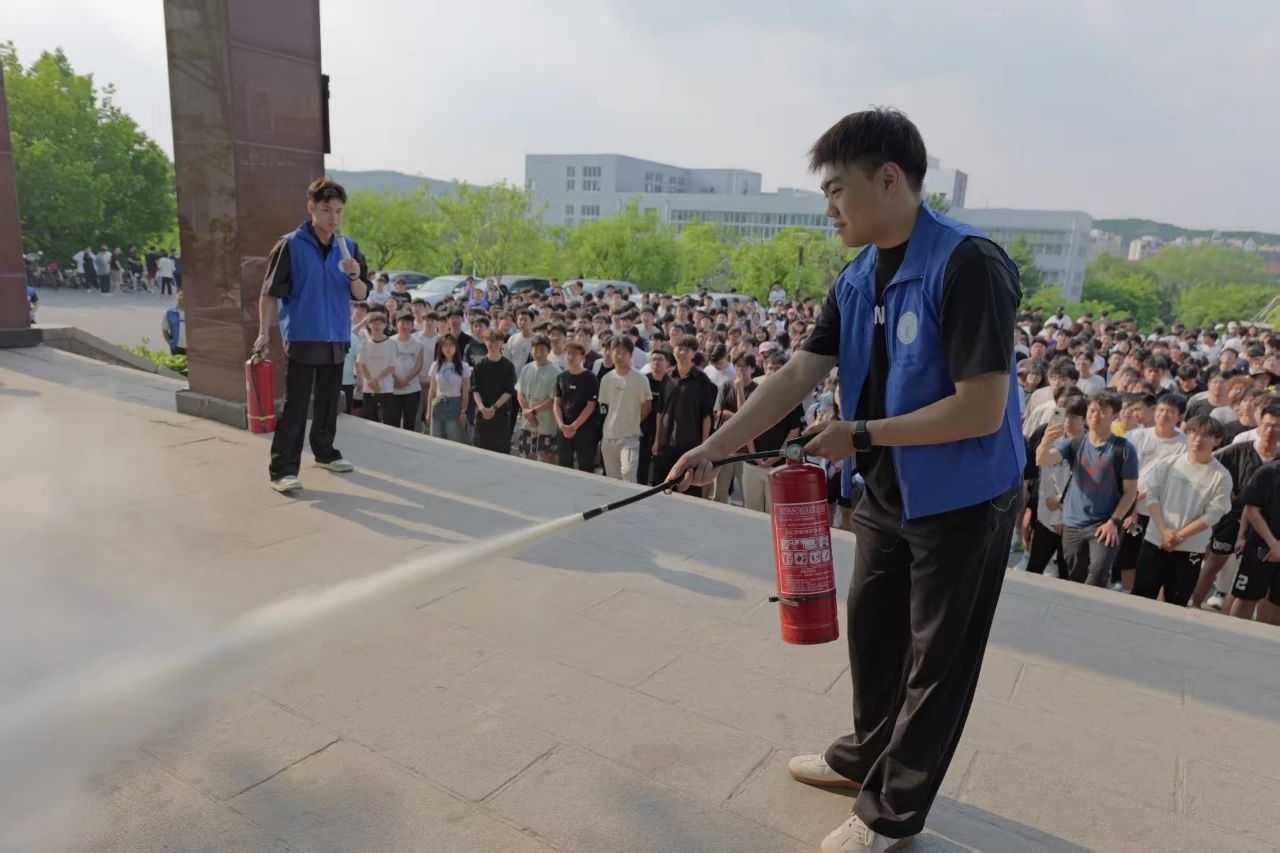 在實操環節,學生骨干蘇永祥化身“消防小導師”,現場講解干粉滅火器、二氧化碳滅火器等常見滅火器的適用范圍與性能特點,學生骨干任梁梓賓協助演示“提、拔、握、壓”四字操作口訣,并指導同學們滅火演練,推動理論知識向實踐能力轉化。
