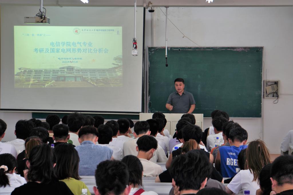 近年來,電信學院電氣工程及其自動化專業的考研以及國網的通過率取得了階段性成功,為激勵學生對未來早規劃,電信學院于6月6日召開電氣專業考研及國家電網形勢對比分析會。會議由電信學院黨委副書記由濟愷主持,全體22級電氣專業學生參加會議。