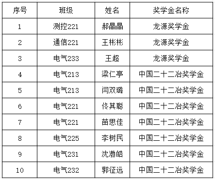 按照遼寧科技大學學生工作處《關于組織開展2023-2024學年度校級校外獎學金評審工作的通知》(遼科大學發〔2025〕2號)相關要求,經學生個人申報、輔導員審核和學院本科生資助工作小組評審,其中龍源獎學金為等額推薦,中國二十二冶獎學金按分配名額1:1.2比例差額推薦,最終擬定郝晶晶等10名同學為2023-2024學年度校級校外獎學金推薦人選。