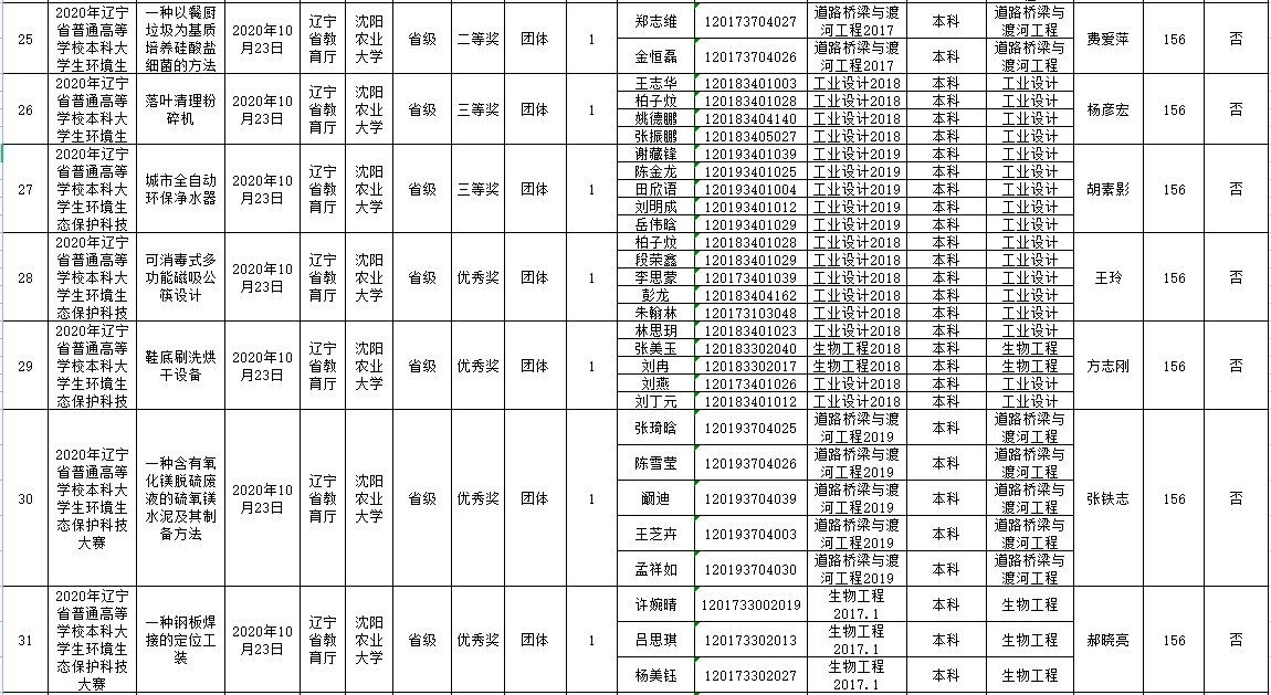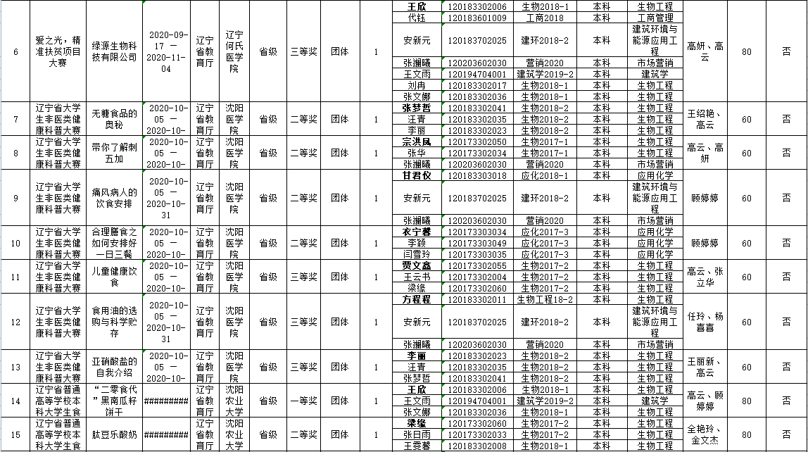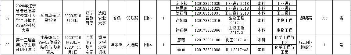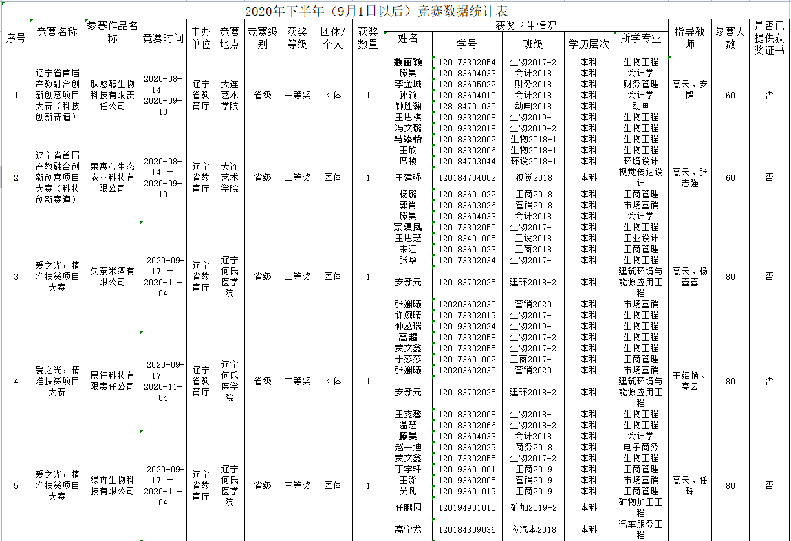 化工學院2020下半年學生創新創業競賽獲獎情況統計表