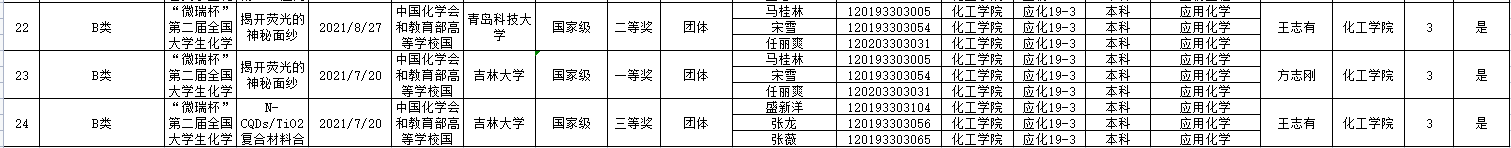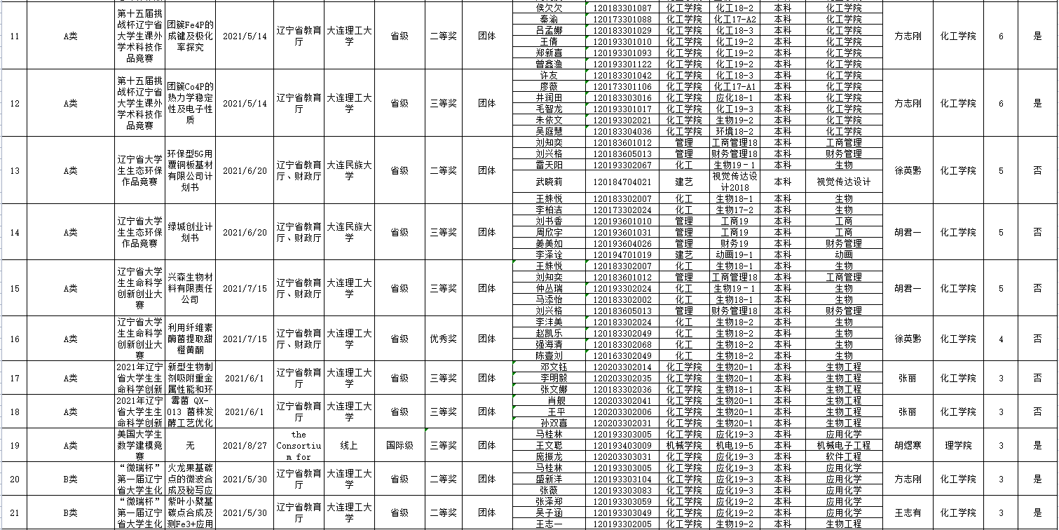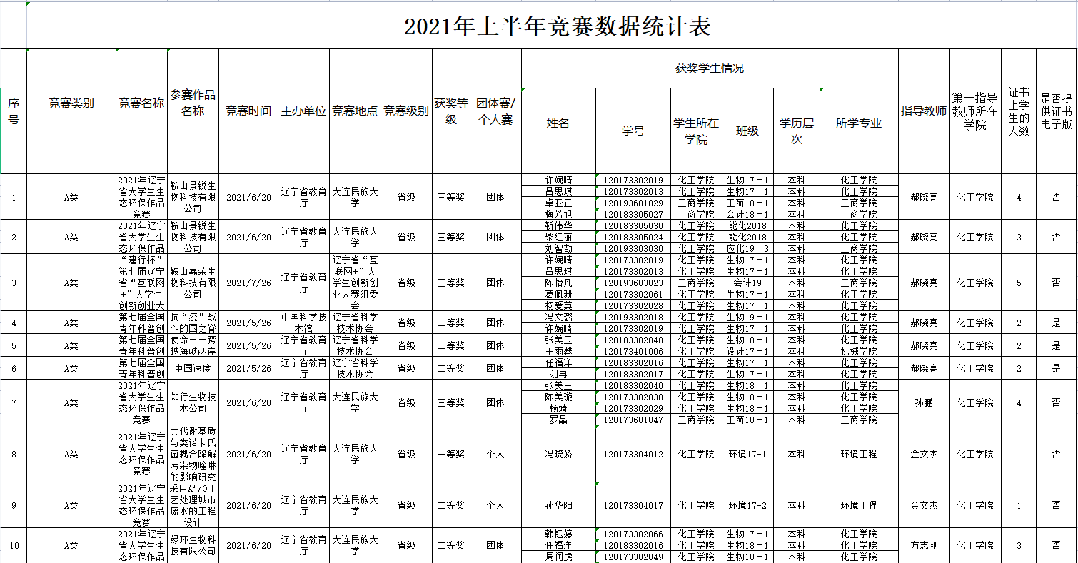 化工學院2021年上半年學生創新創業競賽獲獎情況統計表