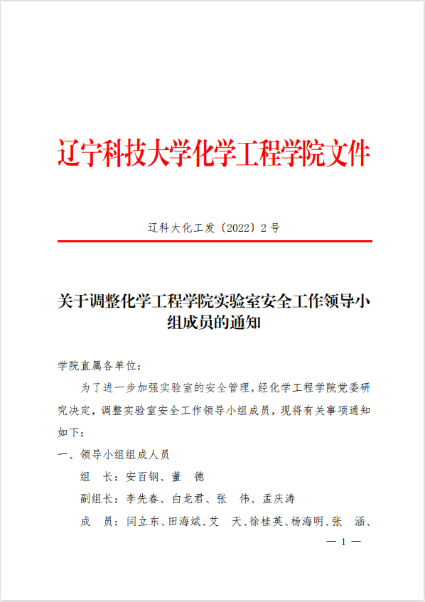 關于調整化學工程學院實驗室安全工作領導小組成員的通知