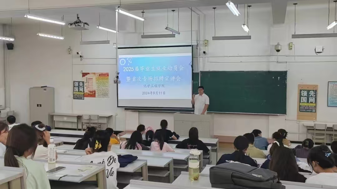 為促進2025屆畢業生全面高質量就業,2024年9月11日,化工學院于博學樓A201教室召開2025屆畢業生就業動員會暨首場專場招聘會。學院黨委副書記蔡秀亮主持會議,學院全體輔導員、用人單位代表、2025屆畢業生參加會議。