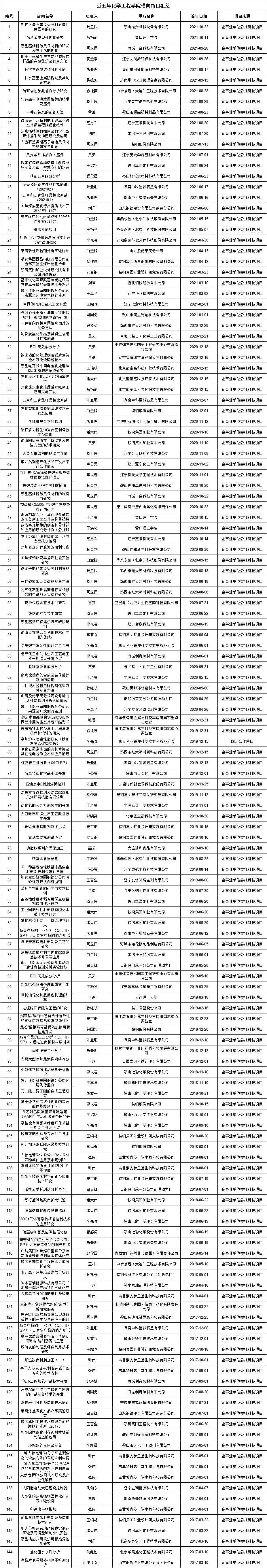 近五年化學工程學院橫向項目匯總