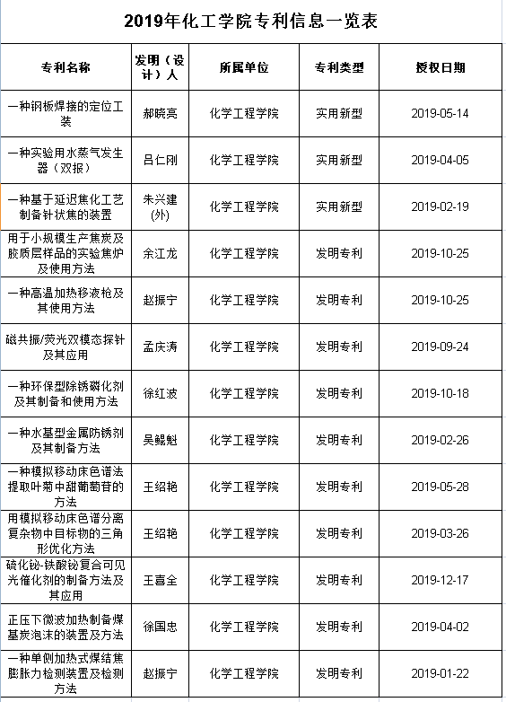 2019年化學(xué)工程學(xué)院專利成果匯總