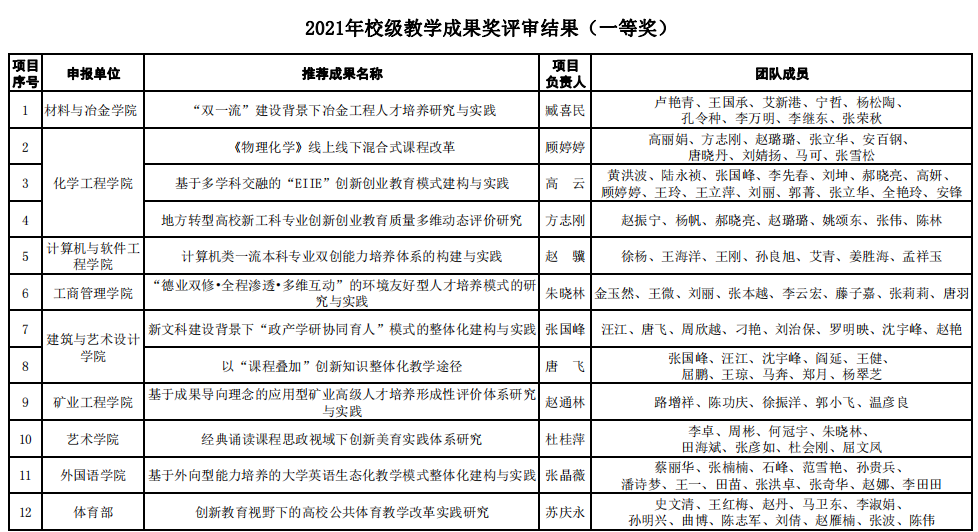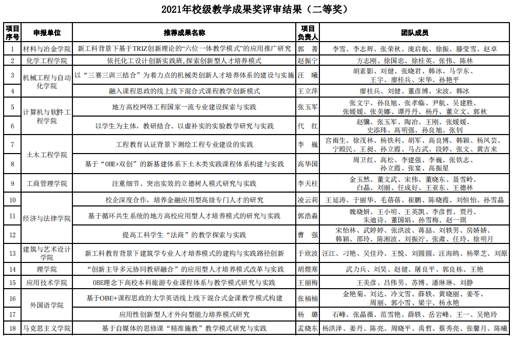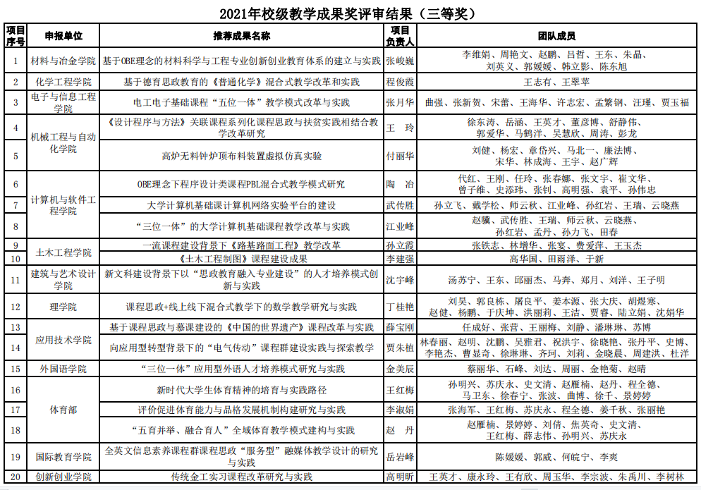 根據《關于開展遼寧科技大學2021年教學成果獎評選工作的通知》(遼科大教發【2021】35號)相關工作安排,各教學單位推薦參評2021年校級教學成果獎共62項。經專家評審,學校研究決定2021年校級教學成果獎獲獎項目為50項,其中一等獎12項,二等獎18項,三等獎20項。獲獎名單公布如下: