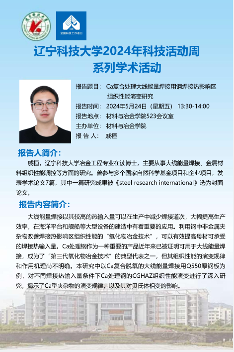 【科技活動周學術預告】Ca復合處理大線能量焊接用鋼焊接熱影響區組織性能演變研究