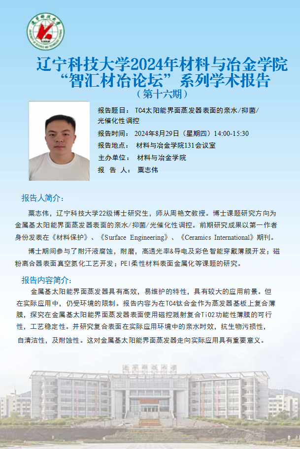 學術預告:TC4太陽能界面蒸發器表面的親水/抑菌/光催化性調控