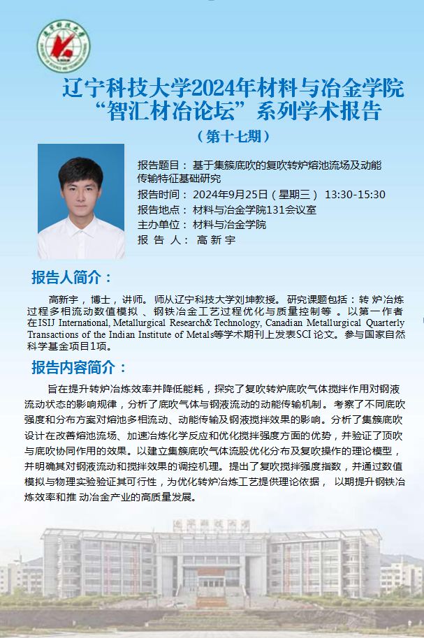 學術預告:基于集簇底吹的復吹轉爐熔池流場及動能傳輸特征基礎研究