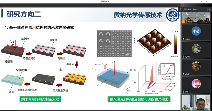 王俊生教授結合自己多年從事海洋傳感與智能檢測技術研究所取得的成果,從海洋傳感與智能檢測技術的背景和意義入手,圍繞檢測基本原理、研究內容、進展和典型應用舉例,重點介紹了微流控芯片檢測技術、微納光學傳感技術、電化學傳感與處理技術、分子電子器件傳感技術、計算光學成像與檢測技術、人工智能檢測技術等6個方向,總結了相關瓶頸問題、技術難點,并針對科學研究及學科建設提出了建議。報告會后,王俊生教授就微納光學傳感、計算光學成像等熱點問題與師生進行了交流。