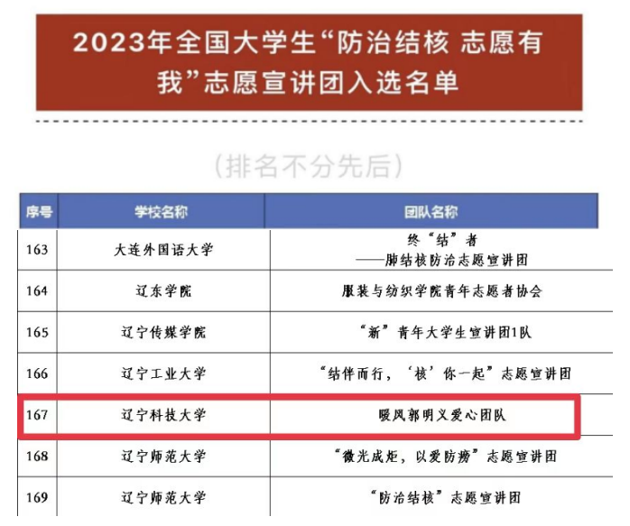近日,遼寧科技大學(xué)“‘暖風(fēng)’郭明義愛心團(tuán)隊(duì)”從來自全國780所高校的1797支團(tuán)隊(duì)中,成功入選2023年全國大學(xué)生“防治結(jié)核 志愿有我”志愿宣團(tuán)。該團(tuán)隊(duì)由遼科大校醫(yī)院門診部與校“郭明義愛心團(tuán)隊(duì)”聯(lián)合組建。活動(dòng)由國家疾病預(yù)防控制局傳染病防控司、團(tuán)中央青年志愿者行動(dòng)指導(dǎo)中心聯(lián)合開展。旨在深入學(xué)習(xí)宣傳貫徹習(xí)近平新時(shí)代中國特色社會(huì)主義思想和黨的二十大精神,落實(shí)習(xí)近平總書記關(guān)于健康中國的重要論述和“從源頭上預(yù)防和控制重大疾病,實(shí)現(xiàn)從以治病為中心轉(zhuǎn)向以健康為中心”的重要指示。
