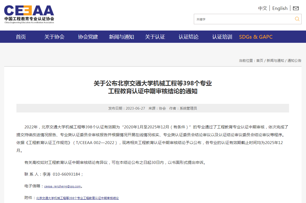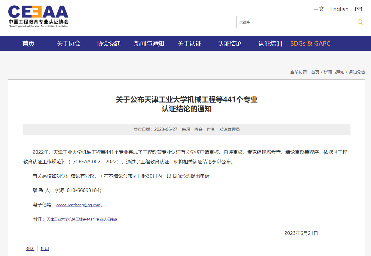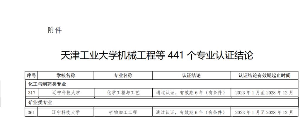 6月21日,中國工程教育專業認證協會官方網站發布了《關于公布天津工業大學機械工程等441個專業認證結論的通知》,遼寧科技大學化學工程學院化學工程與工藝專業、礦業工程學院礦物加工工程專業通過認證,有效期6年(2023年1月至2028年12月),專業將納入《華盛頓協議》互認名單。
