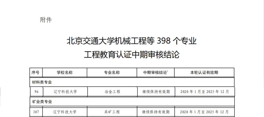 同期發布的《關于公布北京交通大學機械工程等398個專業工程教育認證中期審核結論的通知》顯示,遼科大材料與冶金學院的冶金工程、礦業工程學院的采礦工程共2個認證有效期為“2020年1月至2025年12月(有條件)”的專業,順利通過工程教育專業認證中期審核,依次完成了提交持續改進情況報告、專業類認證委員會審核報告并根據情況開展在線情況核實、專業類認證委員會結論審議以及認證結論審議委員會結論審議等程序。