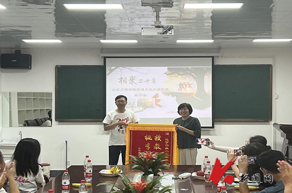 交通1999.2班班長王井友代表全體校友發言,他對學校校友辦、學院領導及老師的支持幫助和熱情接待表示感謝,并向學院贈予錦旗表達對母校的感恩之情。座談氣氛輕松,情誼濃濃。與會校友紛紛表示要以此次交流為契機,支持學院工作,為母校發展多貢獻一份力量。(供稿單位:土木學院 圖片來源:土木學院)