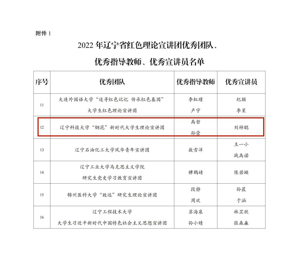 近日,共青團遼寧省委員會、遼寧省學生聯合會聯合通報2022年遼寧省大學生紅色理論宣講團考核表彰結果,遼寧科技大學“鋼花”新時代大學生理論宣講團獲評2022年遼寧省大學生紅色理論宣講團優(yōu)秀團隊。宣講團負責人劉梓聰獲評“優(yōu)秀宣講員”榮譽稱號。