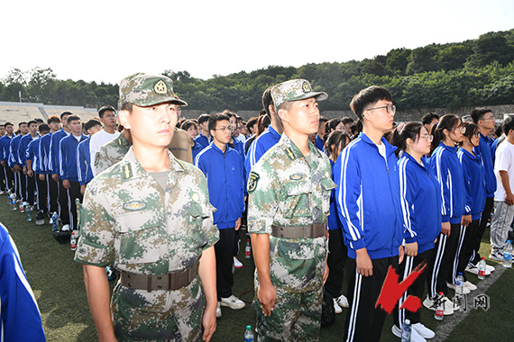 開營式由軍訓團副團長、學生工作處(部)處(部)長紀振廷主持。開營式上,軍訓團副團長、安全保衛處處長、武裝部部長郭志輝作動員講話。郭志輝說,同學們要深刻理解把握習近平總書記對青年學生的深情厚望,做一個有方向、有目標、有追求的人;做一個有格局、有擔當、有情懷的人;做一個有正氣、有底氣、有朝氣的人。要深刻認識軍事訓練對學生成長成才的重要意義,并通過軍訓,培養出堅強的意志品質,培養出高尚的愛國主義情懷,培養出敢擔當、勇作為的優良作風。教官代表張瀚文,新生代表工商管理學院2023.2班傅靖雯作表態發言,他們一致表示,要不辭辛苦、互敬互愛、相互幫助,確保軍訓順利進行。