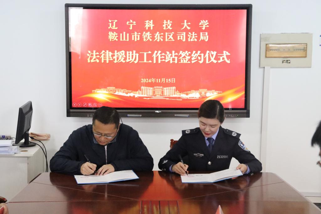 11月15日,遼科大經法學院與鞍山市鐵東區司法局舉行“法律援助工作站”簽約儀式。本次簽約儀式由經法學院副院長邵玲主持,鐵東區司法局局長肖冰等一行6人、經法學院主要領導、教師代表及部分法學專業學生代表參加了簽約儀式。