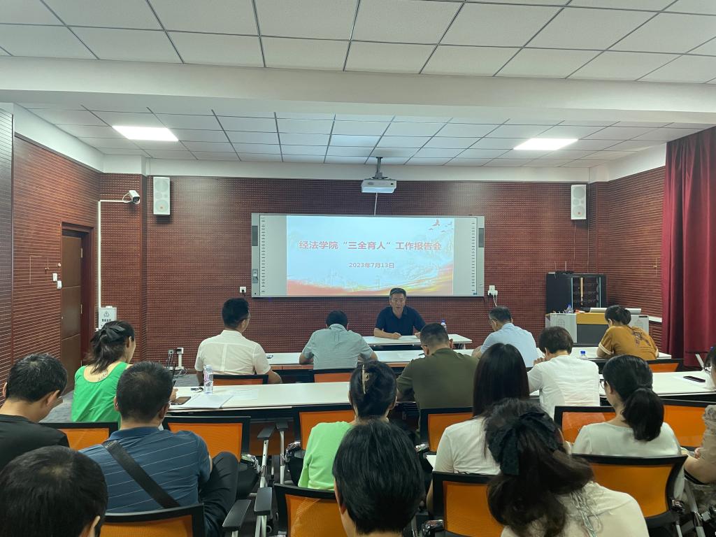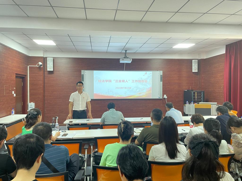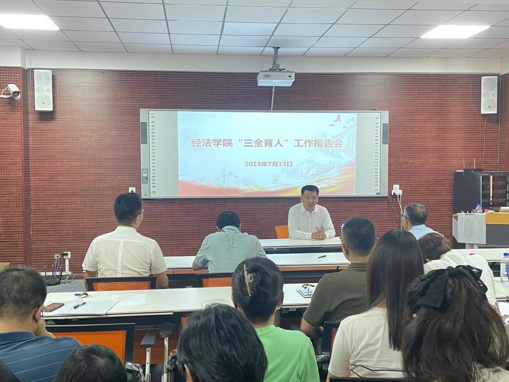 7月13日上午,經(jīng)濟與法律學(xué)院在博識樓A407會議室召開了"三全育人"報告會。會議由學(xué)院黨委書記趙智博主持,法律系主任蔣喆,國貿(mào)系主任王英凱和學(xué)院團委副書記張鵬飛3名教師作經(jīng)驗交流報告,全院教職工出席了會議。
