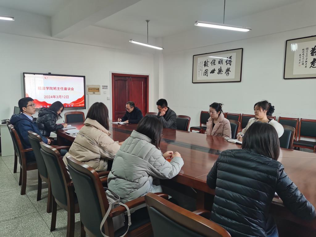 3月12日,經法學院于博識樓A315召開2023級班主任座談會議,會議由學院黨委副書記張國華主持,學院黨委書記趙智博、學辦主任齊艷萍以及李俊等7位2023級班主任參加了會議。