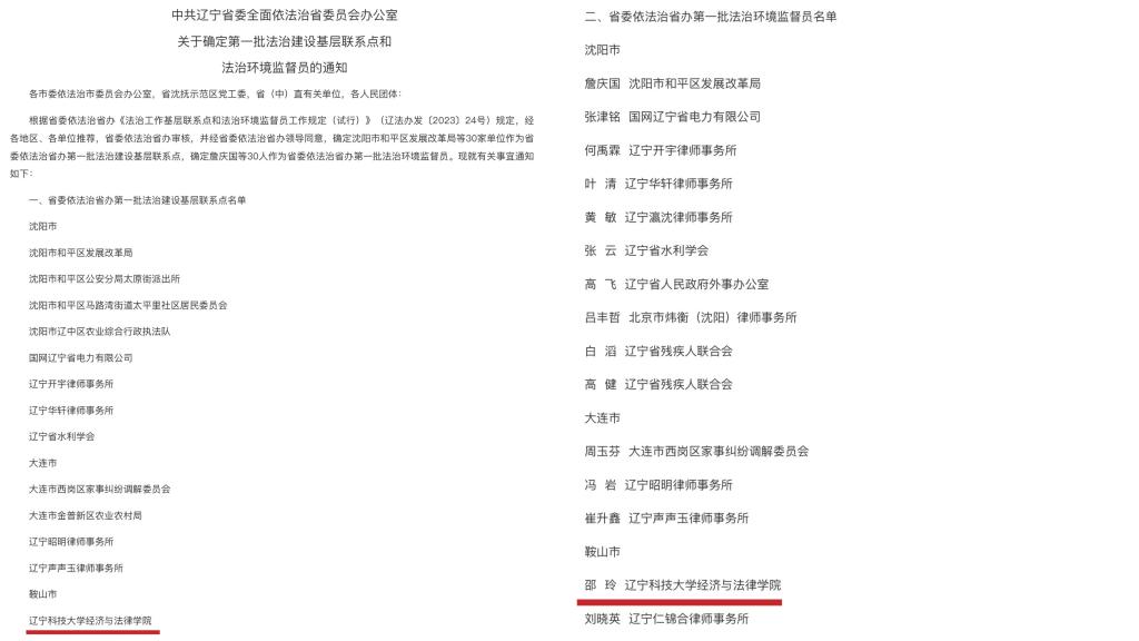 近日,遼寧省司法廳發布《中共遼寧省委全面依法治省委員會辦公室關于確定第一批法治建設基層聯系點和法治環境監督員的通知》,遼寧科技大學經濟與法律學院被確定為省委依法治省辦第一批法治建設基層聯系點,副院長邵玲被確定為省委依法治省辦第一批法治環境監督員。