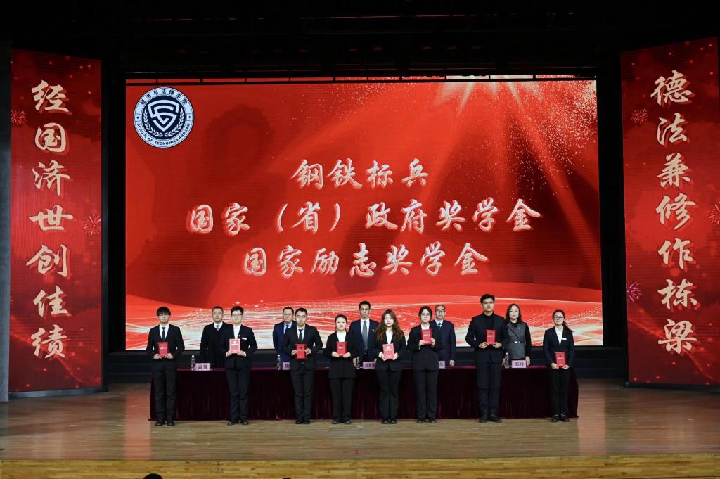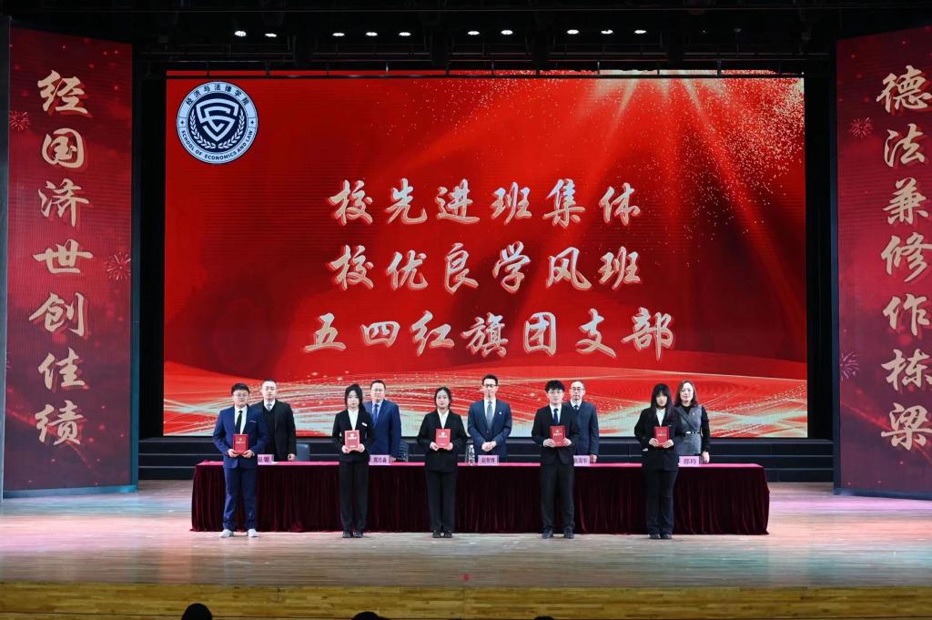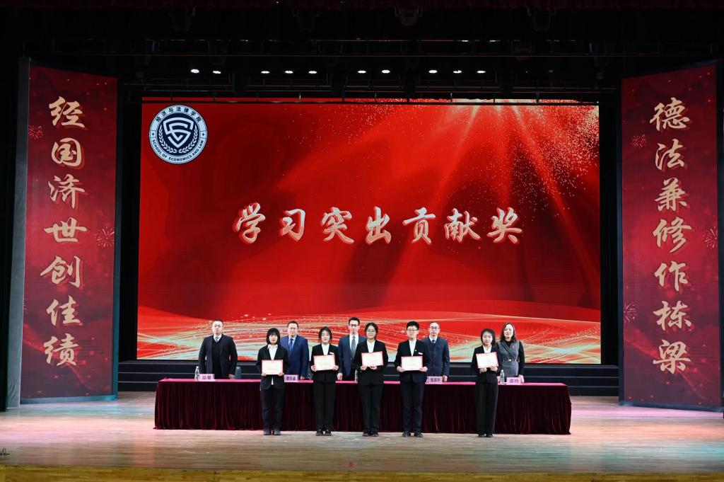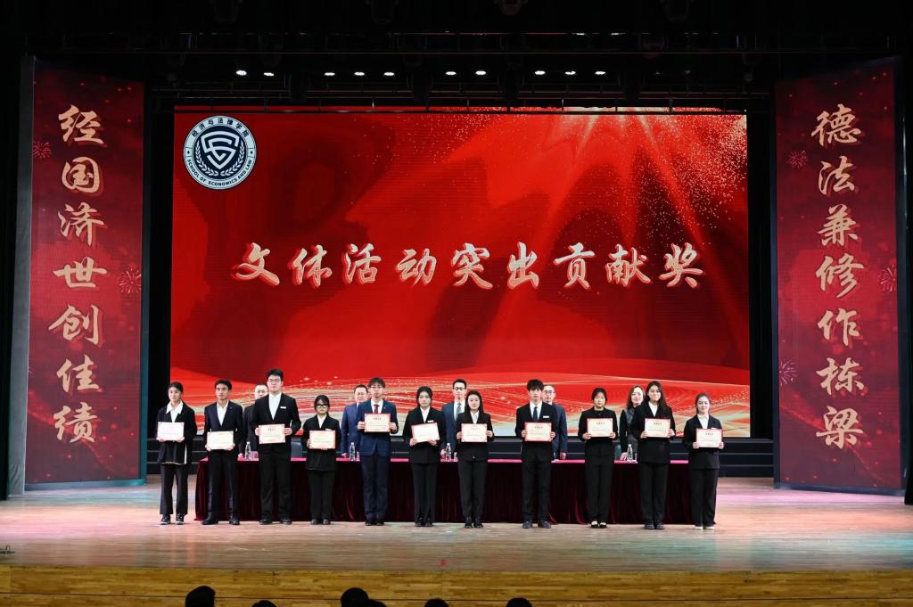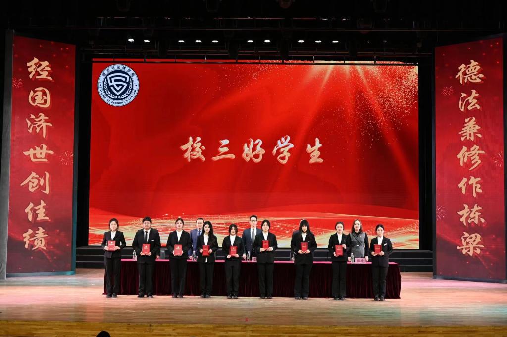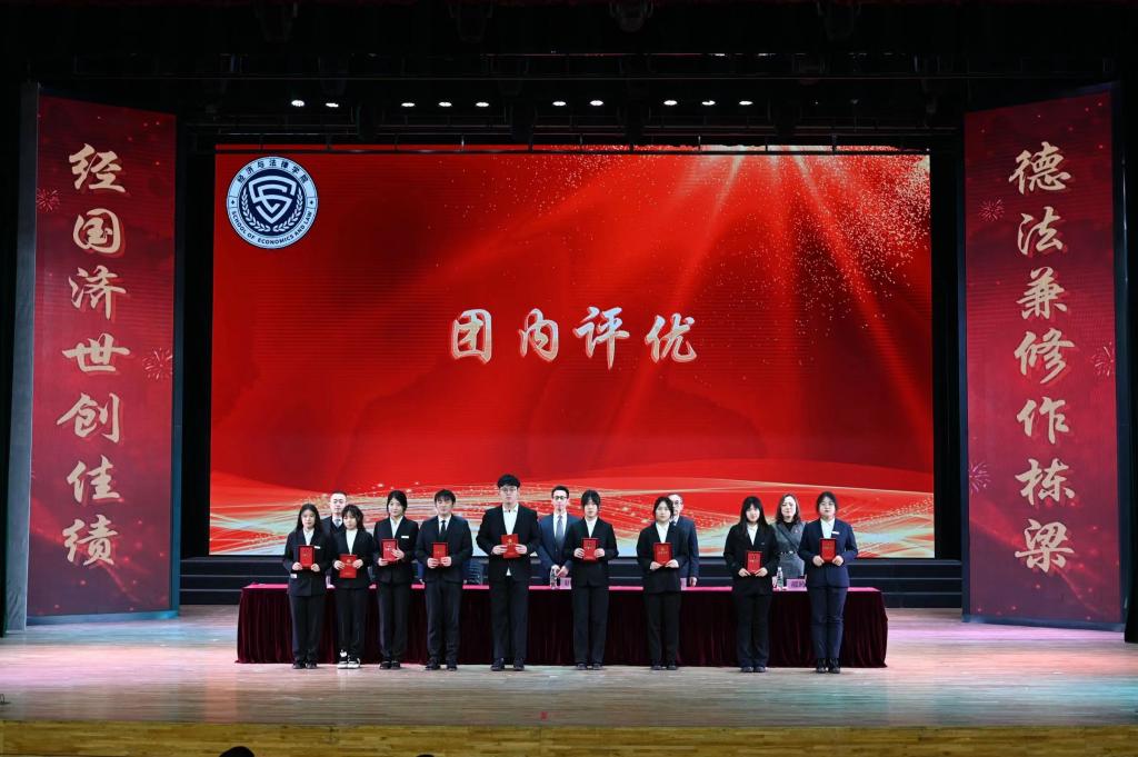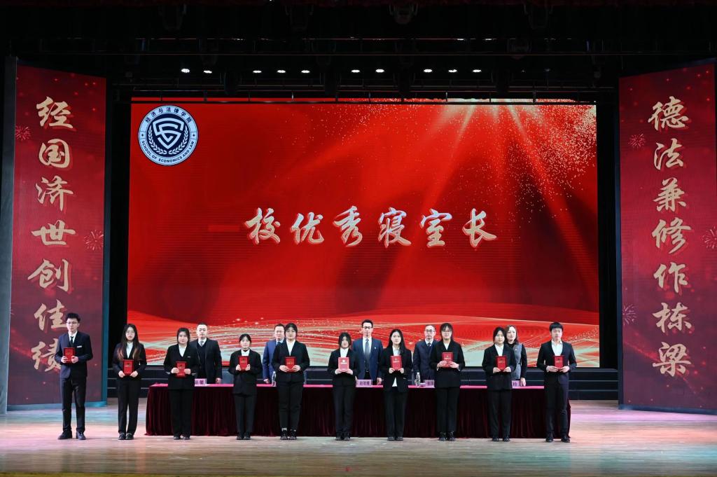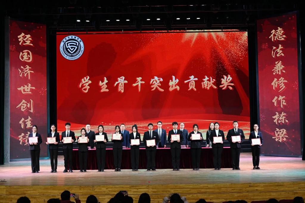 在經法學院副院長溫馨宣讀評優表獎名單后,與會領導為獲得榮譽的36個優秀集體和113個優秀個人頒發榮譽證書并合影留念。每一位獲獎成員臉上都洋溢著自豪的笑容,觀眾席上掌聲陣陣,現場氣氛熱烈。學生骨干突出貢獻獎獲得者吳雨純作為學生代表發言,她向悉心教導學生的學院領導和老師們表達了真摯的感謝,并鼓勵同學們以嚴謹務實的求學態度、科學高效的學習方法刻苦鉆研,力爭上游;同時注重理論和實踐相結合,提高綜合素質,實現全面發展。