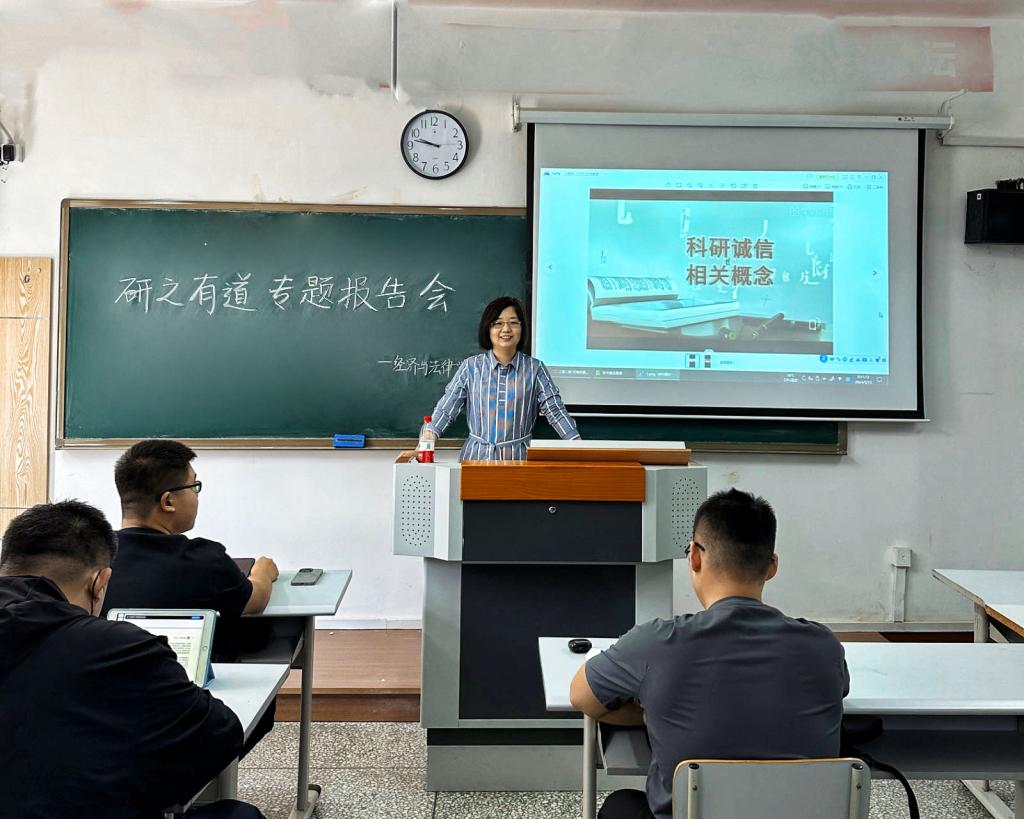 交流會上,武婷婷老師首先強調了科研誠信和學術規范的重要性。隨后,她結合自身豐富的科研經驗,從研究選題、文獻綜述、研究方法選擇、數據分析以及論文撰寫等方面,詳細介紹了學術研究的整個流程。在師生互動環節,法碩研究生結合近期的學習經歷和體會,圍繞未來的就業方向、職業規劃、申博考博等問題進行了提問,老師一一進行了耐心解答,給出了針對性、前瞻性的建議,同學們收獲頗多。會議最后,武婷婷老師寄語法碩學子:珍惜校園時光、鍛煉本領、砥礪前行!