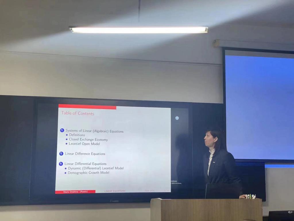 交流中,遼科大經(jīng)法學(xué)院院長郭浩淼介紹了經(jīng)法學(xué)院國際經(jīng)濟與貿(mào)易、金融和金融科技三個專業(yè)的發(fā)展現(xiàn)狀、主要研究方向及近幾年取得的主要研究成果。Галкин Александр Васильевич院長向經(jīng)法學(xué)院師生介紹了俄羅斯利佩茨克州、利佩茨克國立技術(shù)大學(xué)的基本情況及如何運用EPR軟件的核心算法來優(yōu)化管理生產(chǎn)計劃;Сысоев Антон Сергеевич副院長講授了如何運用應(yīng)用線性回歸模型來描述社會經(jīng)濟系統(tǒng)的動態(tài)問題;Орешина Мария Николаевна主任介紹了代數(shù)方程組、微分和差分模型在經(jīng)濟分析中的應(yīng)用。與會的經(jīng)法學(xué)院師生與三位俄方教師就相互關(guān)心的學(xué)術(shù)問題進行了深入的交流互動。