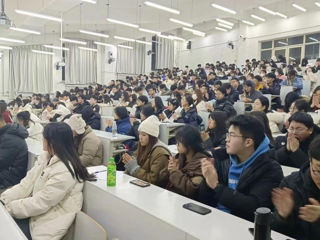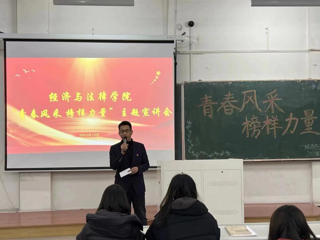 12月10日,經(jīng)法學(xué)院于博學(xué)樓C102開展“青春風(fēng)采 榜樣力量”主題宣講會。學(xué)院優(yōu)秀學(xué)生代表2023年鋼鐵標(biāo)兵年度人物代郁璇、十佳大學(xué)生張詩晗琪、道德楷模劉豪、十大學(xué)習(xí)標(biāo)兵于瀾受邀擔(dān)任宣講人,經(jīng)法學(xué)院黨委書記趙智博以及團學(xué)骨干出席會議,學(xué)院2022級、2023級350名本科生參加會議。