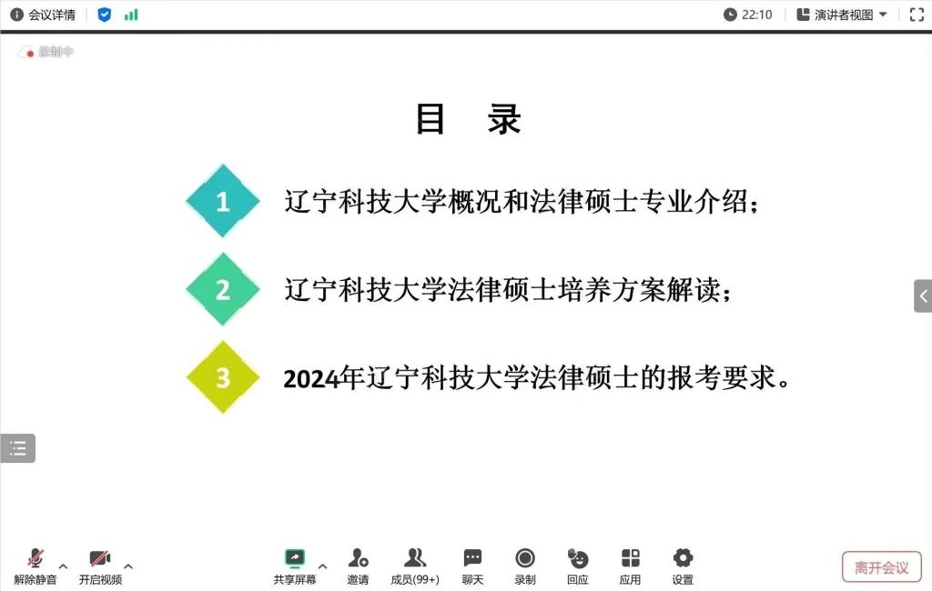本次線上招生宣講會的成功召開使學生們對遼科大經法學院有了更深入的了解。經法學院近年來不斷加強學科建設,在教學和科研方面加大投入,使得法碩培養方案更加完善,更加符合社會實際需求,未來經法學院將繼續堅持高質量發展,努力培養高水平應用型法律專業人才。