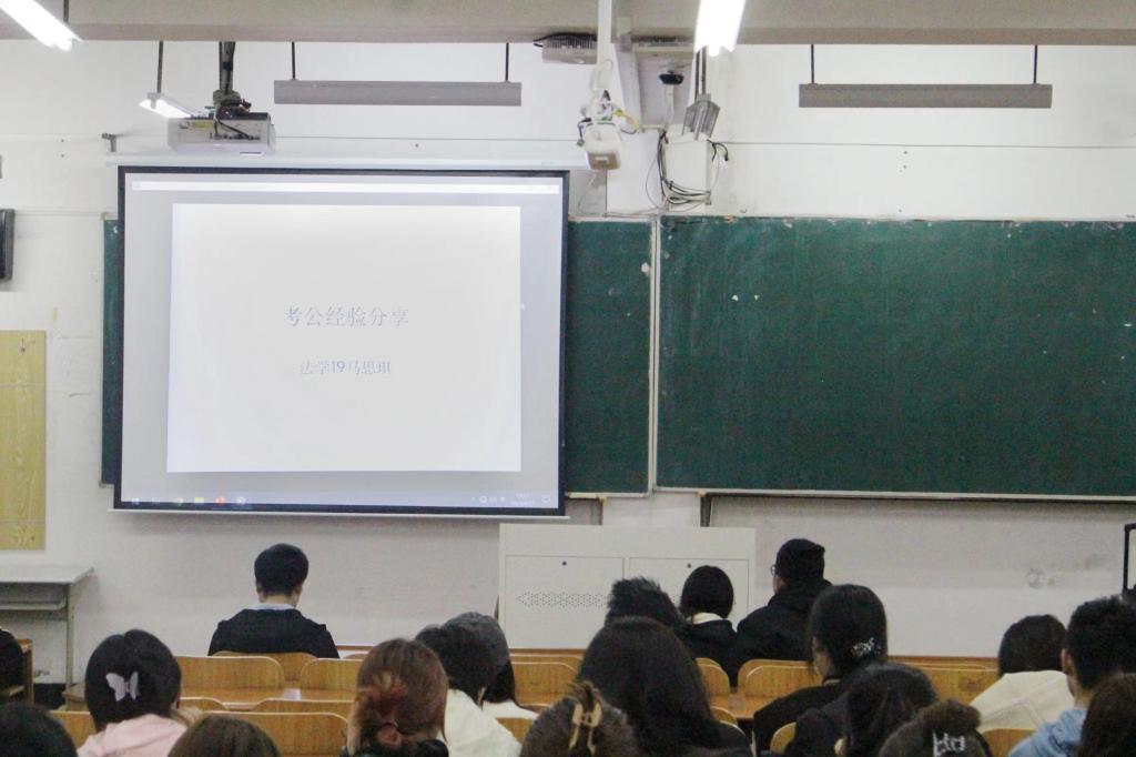 法碩20沈逍、法學19馬思琪則分享了自己的考公經驗。兩名同學從前期準備、言語理解、判斷推理以及面試技巧幾個方面向大家進行了詳細的介紹,以“關關難過關關過,前路漫漫亦燦燦”引出在備考過程中要始終保持堅持不懈的態度和積極平穩的心態,他們鼓勵學弟學妹要勇于面對各種挑戰,用行動與汗水戰勝一切困難,前方之路必定光明璀璨。