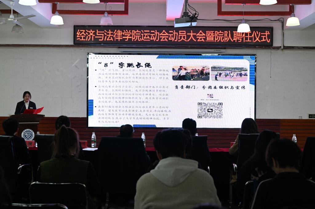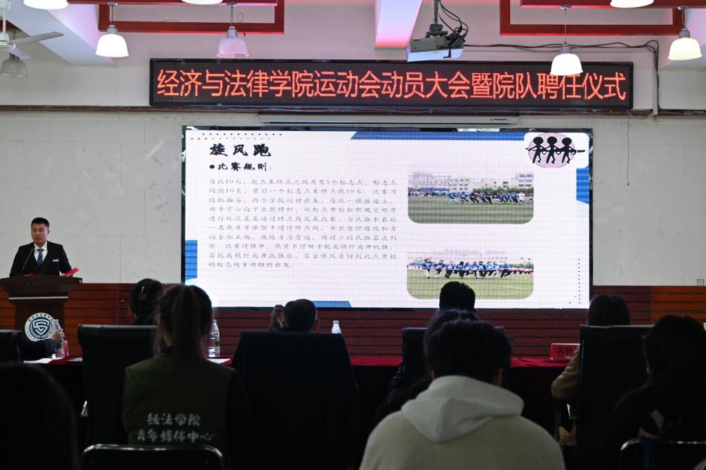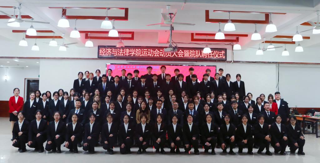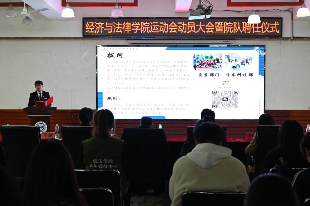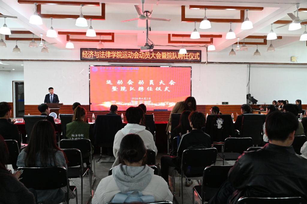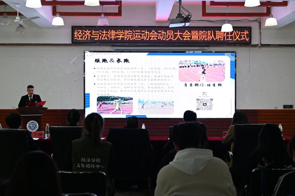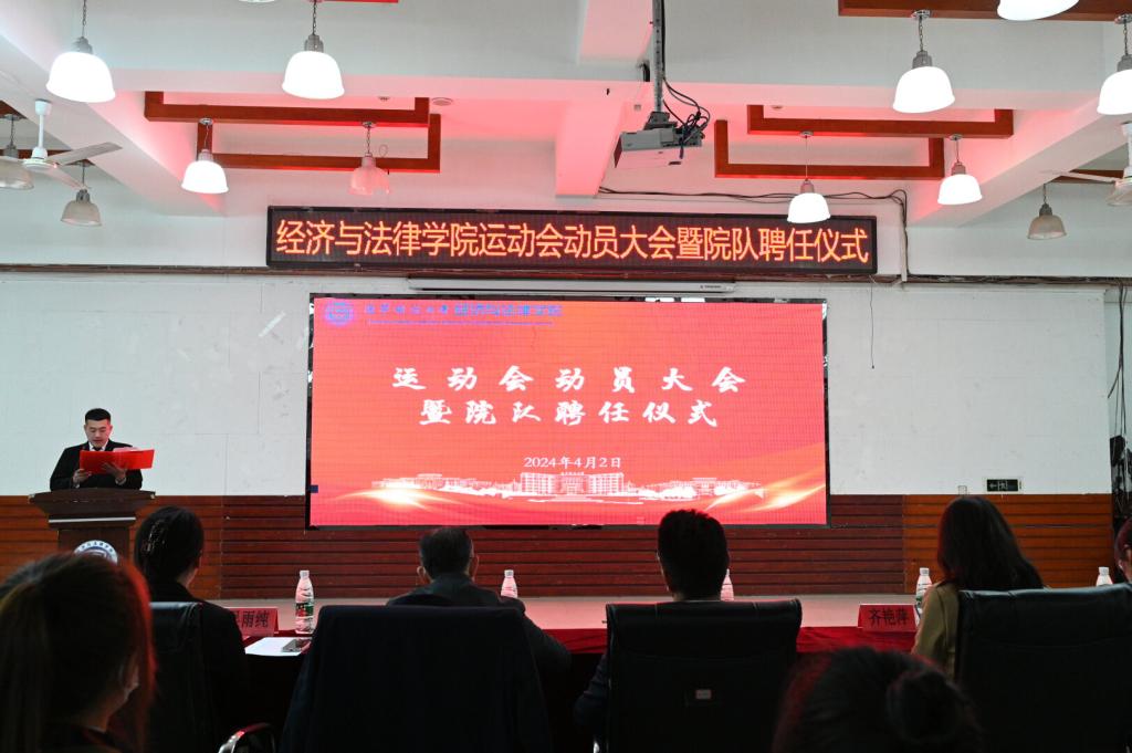 4月2日,經(jīng)法學(xué)院于明德樓大學(xué)生活動中心召開運(yùn)動會動員大會暨院隊(duì)聘任儀式。本次大會由經(jīng)法學(xué)院團(tuán)委副書記張鵬飛主持,學(xué)院黨委書記趙智博、黨委副書記張國華、學(xué)辦主任齊艷萍出席會議,學(xué)院各院隊(duì)正、副隊(duì)長、全體團(tuán)學(xué)骨干以及2023級全體學(xué)生共計(jì)300余人參加會議。