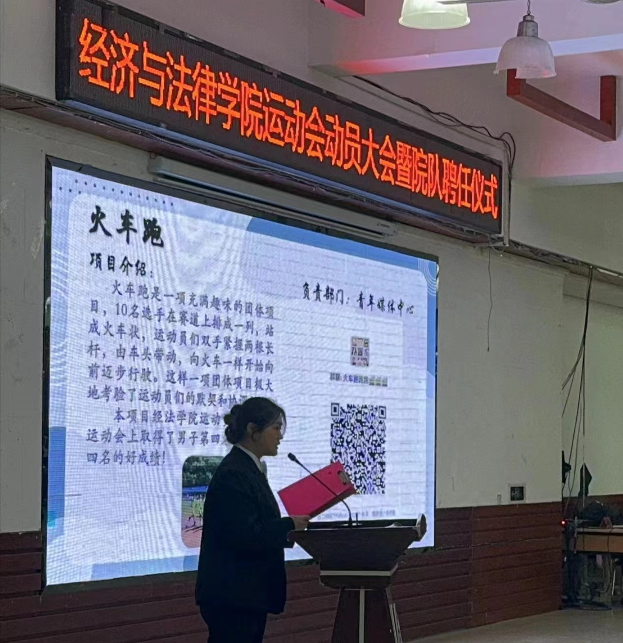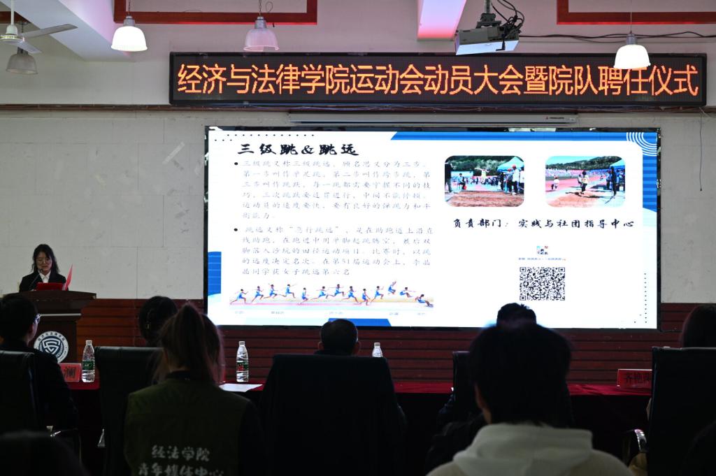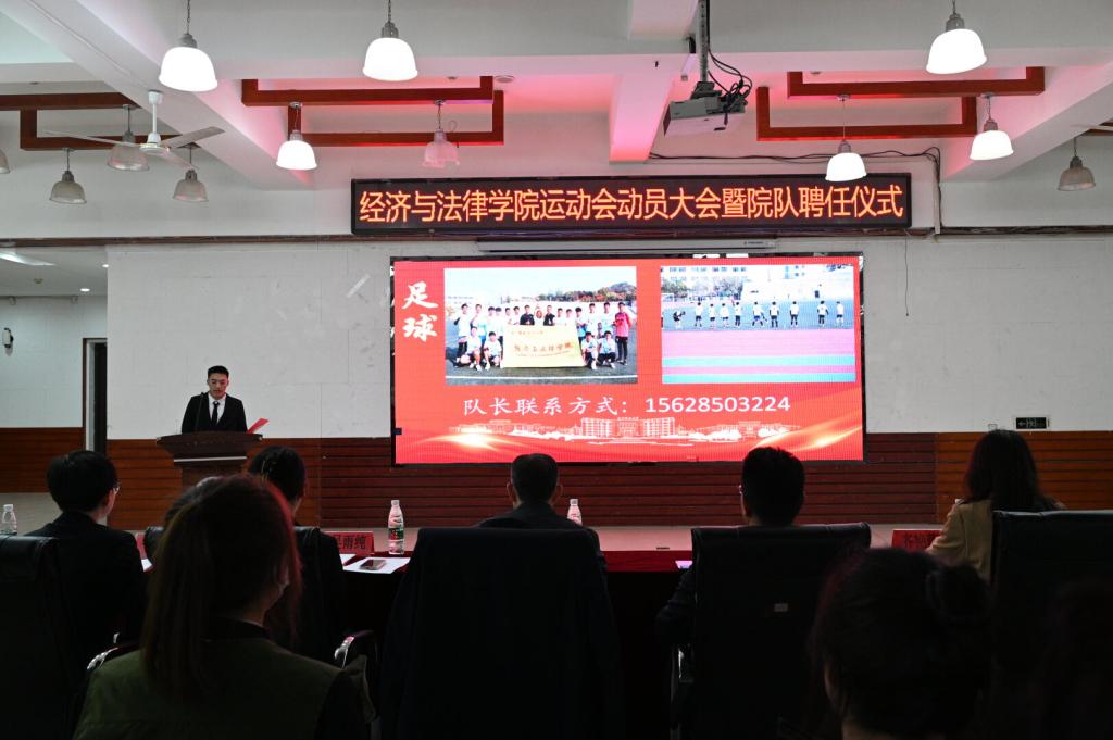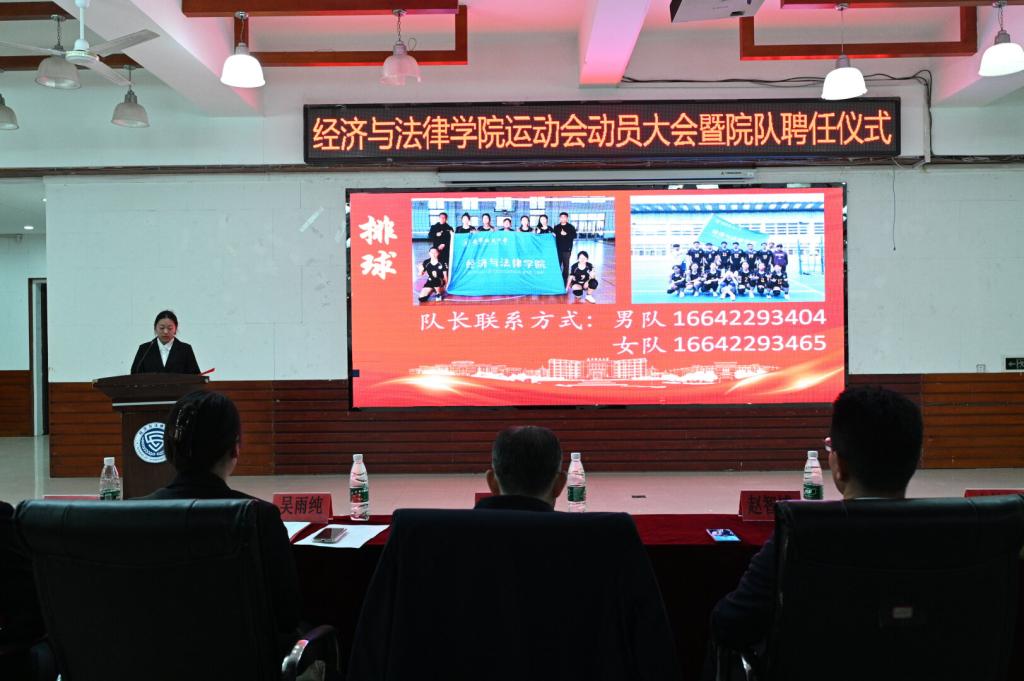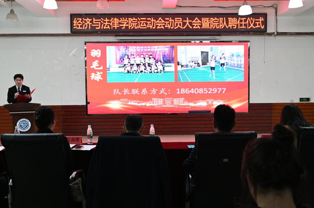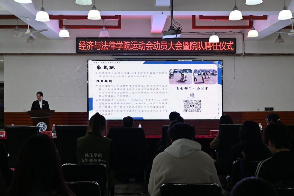 4月2日,經(jīng)法學(xué)院于明德樓大學(xué)生活動中心召開運(yùn)動會動員大會暨院隊(duì)聘任儀式。本次大會由經(jīng)法學(xué)院團(tuán)委副書記張鵬飛主持,學(xué)院黨委書記趙智博、黨委副書記張國華、學(xué)辦主任齊艷萍出席會議,學(xué)院各院隊(duì)正、副隊(duì)長、全體團(tuán)學(xué)骨干以及2023級全體學(xué)生共計(jì)300余人參加會議。
