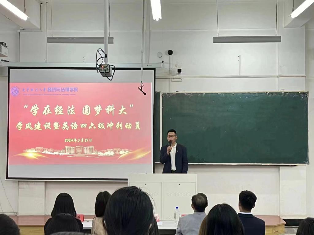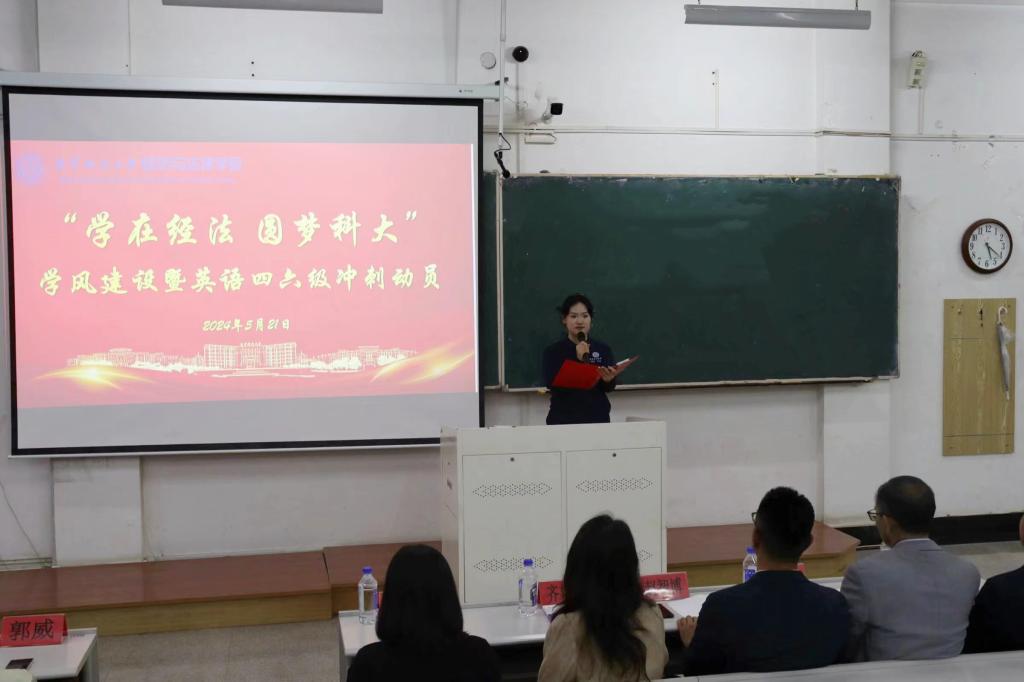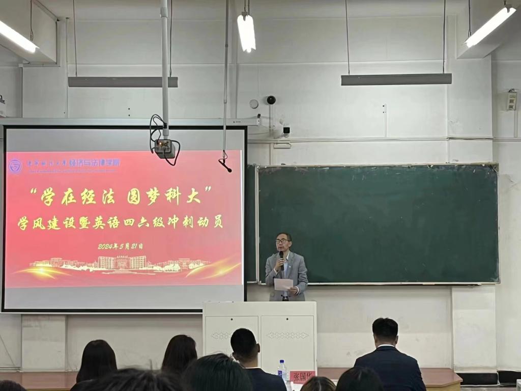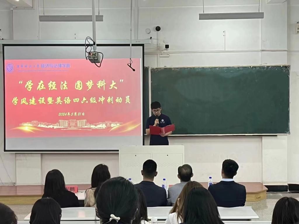 5月21日,經(jīng)法學院于博學樓C102召開“學在經(jīng)法,圓夢科大”學風建設暨英語四六級考試動員大會,學院黨委書記趙智博、黨委副書記張國華、學辦主任齊艷萍、團委副書記張鵬飛、金融系主任崔鵬、金融科技系主任郭威、國貿(mào)23-2班班主任李俊、金融科技23-2班班主任劉擎、金融23-2班班主任秦子璇出席會議,學院各年級近350名學生參加了會議。