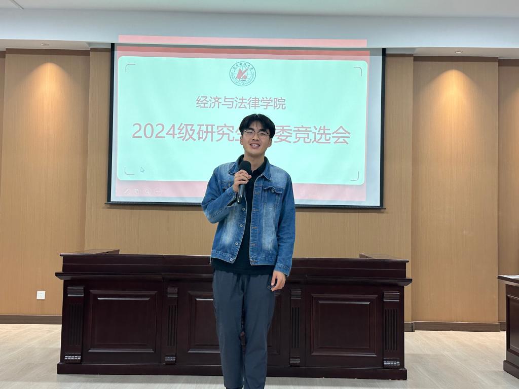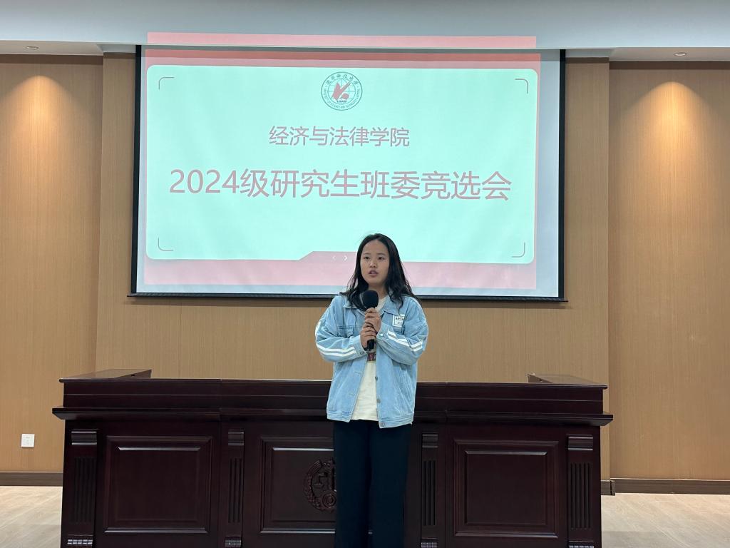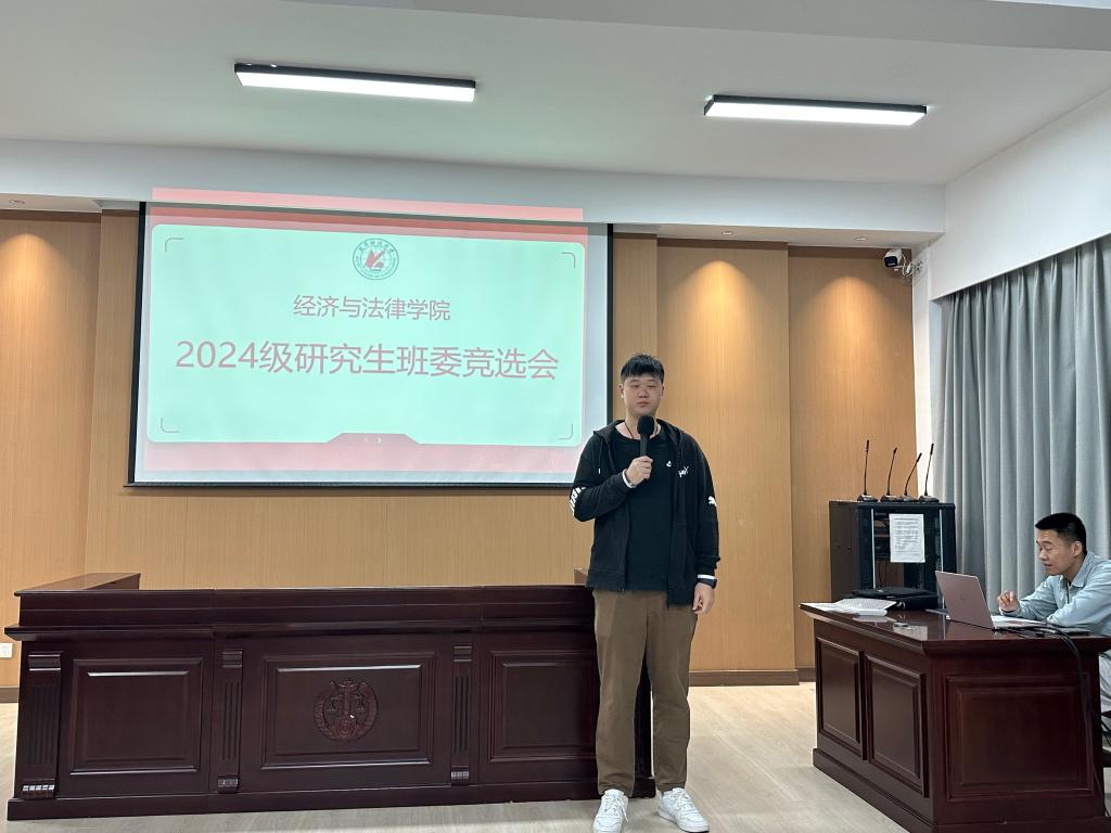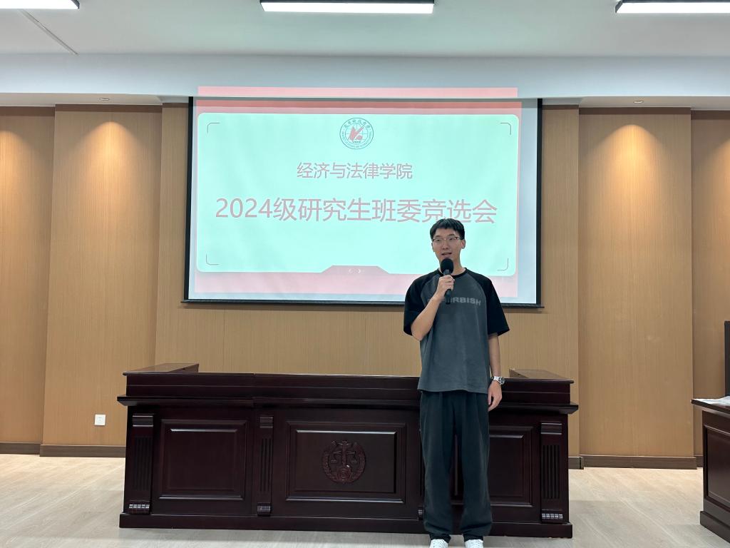 為使班級的各項工作及管理有序進行,讓同學們的生活、學習得到更好的維護與保障,9月18日,經法學院2024級研究生于博識樓A402開展班委競選活動,此次競選由經法學院研究生會執行主席張淇主持,研究生輔導員賀偉、學院研究生會主席團代表、學辦學生助管、學生代表7人組成評委會,2024級全體研究生參會。