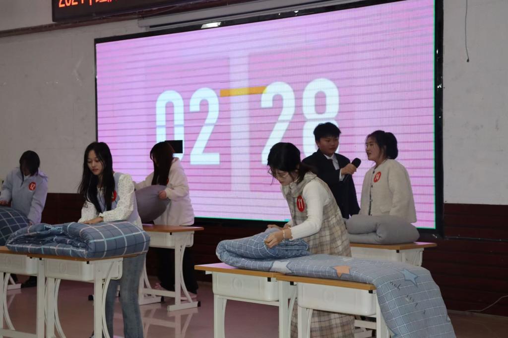 “疊被子大賽”環節同樣精彩,隨著主持人一聲令下,參賽者迅速投入狀態。盡管兩位主持人輪番提問進行“干擾”,但選手們依舊細致專注地完成被子整理。三分鐘后,一床床如藝術品般棱角分明的被子呈現在觀眾眼前,現場氣氛火爆,歡呼聲此起彼伏。最后,學院學生會文藝團王美潤帶來的《這世界那么多人》,以優美的旋律和動人的歌聲,引起了觀眾的情感共鳴。經過激烈的角逐,頒獎嘉賓為獲獎學生頒獎,現場爆發出雷鳴般的掌聲,這掌聲既是對獲獎學生的肯定,也是對這場精彩角逐的喝彩。