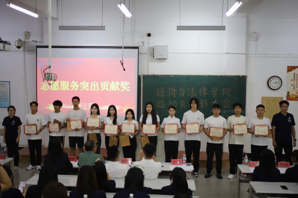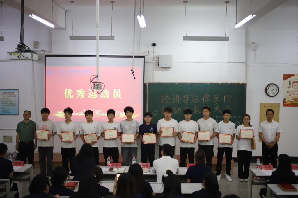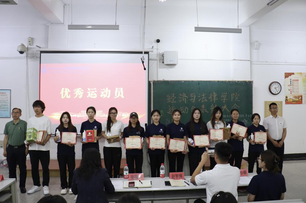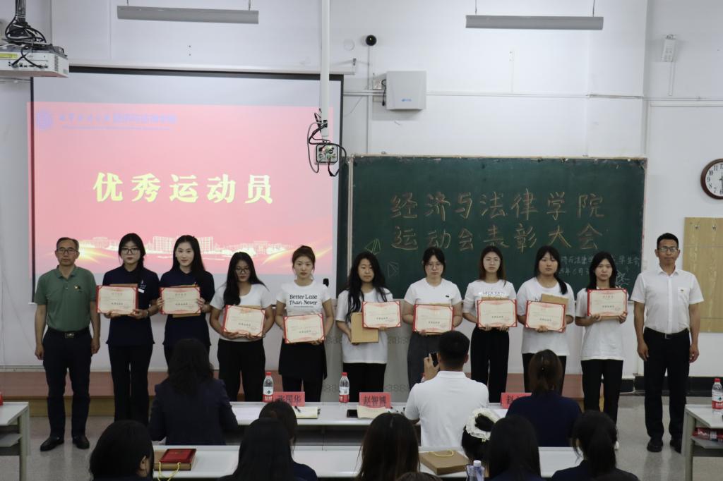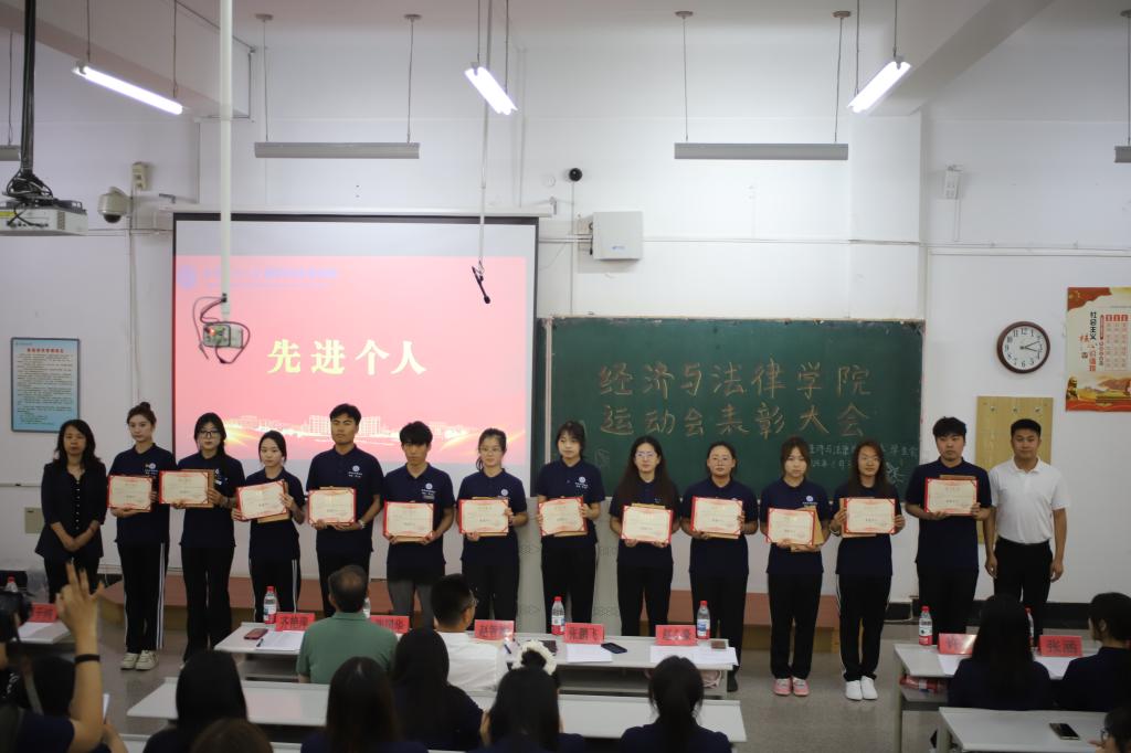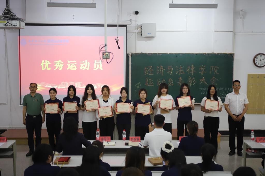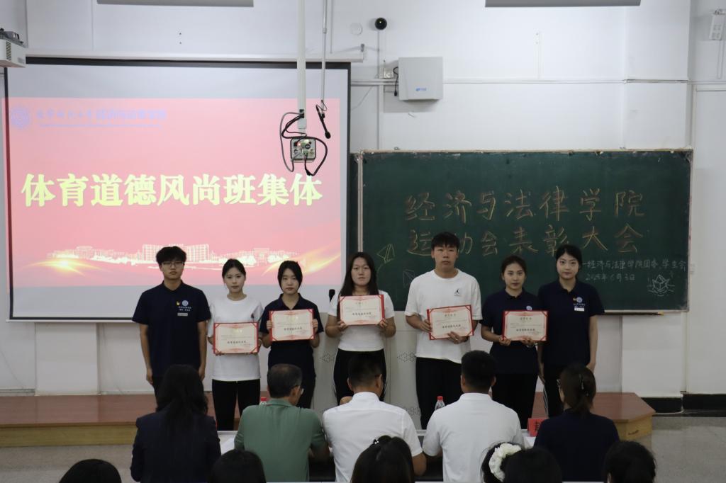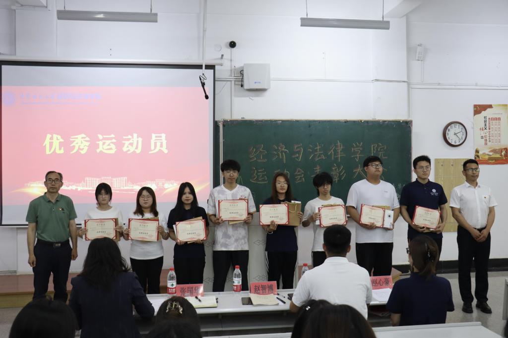 會議伊始,全體與會人員共同奏唱國歌。通過一段精心制作的視頻,大家共同回顧經法運動健兒在第五十三屆運動會中的卓越表現。隨后,團委副書記張鵬飛宣讀學院體育道德風尚獎、志愿服務突出貢獻獎、先進個人及優秀運動員的獲獎名單。團委學生副書記邱千純、劉帥家為5個班級頒發體育道德風尚獎;學生會執行主席趙心豪、體育部負責人李佳澳為12名優秀志愿者頒發榮譽證書;學辦主任齊艷萍、團委副書記張鵬飛為21名運動會工作人員授予先進個人獎;黨委書記趙智博、黨委副書記張國華為79名優秀運動員頒發榮譽證書。最后,獲獎學生與老師合影留念,掌聲雷動。