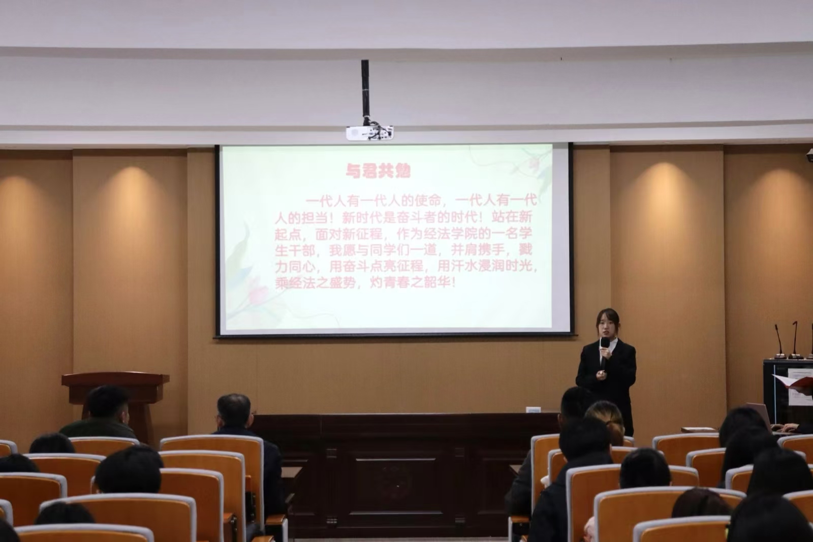 學生會執(zhí)行主席兼辦公室負責人趙心豪等5名學生骨干代表依次上臺發(fā)言,就個人工作心得及學習經驗進行了分享。他們勉勵各位學生骨干積極參與志愿服務、學科競賽、社會實踐等活動,充分發(fā)揮模范帶頭作用。在分享過程中,他們展示了英語四六級的學習資源及成長規(guī)劃,著重強調了平衡學業(yè)和工作之間關系的重要性,為學院優(yōu)良學風的建設奠定了堅實基礎。