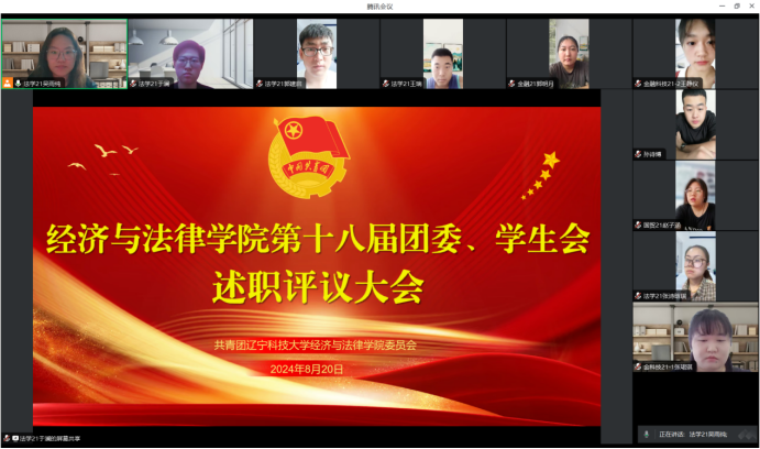 8月20日,經法學院于騰訊會議APP召開第十八屆團委、學生會述職評議會,會議由學院學生會執行主席兼辦公室負責人吳雨純主持,團委、學生會各部門負責人參加本次會議。