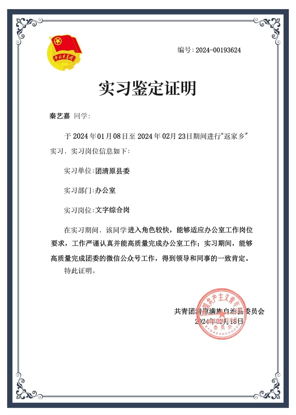 秦藝嘉,女,共青團(tuán)員,金融23-1班學(xué)生,現(xiàn)任校大學(xué)生自我管理委員會(huì)辦公室工作人員。2024年寒假期間,該生以青春之名、赴家鄉(xiāng)之約,在團(tuán)清原縣委辦公室開展為期一個(gè)半月的實(shí)踐活動(dòng)。