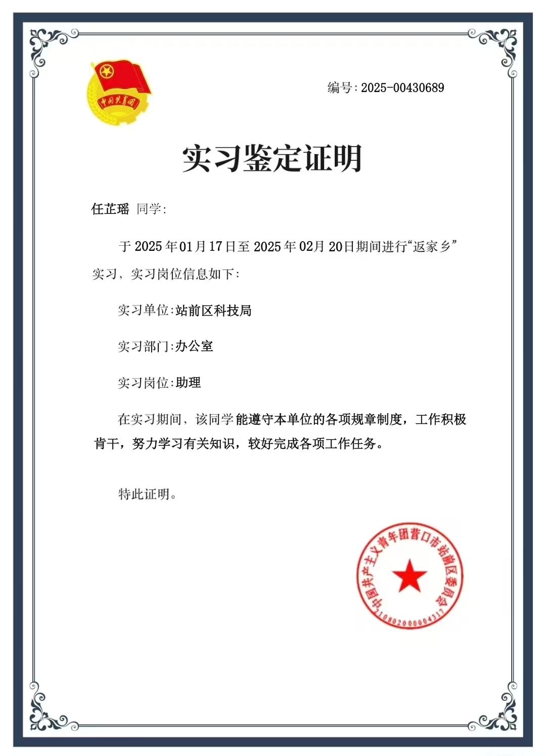 任芷瑤,女,共青團員,金融24-1班學生,現任班級班長。寒假期間她積極響應“返家鄉”社會實踐號召,在營口市站前區科技局開展為期一個月的志愿服務。