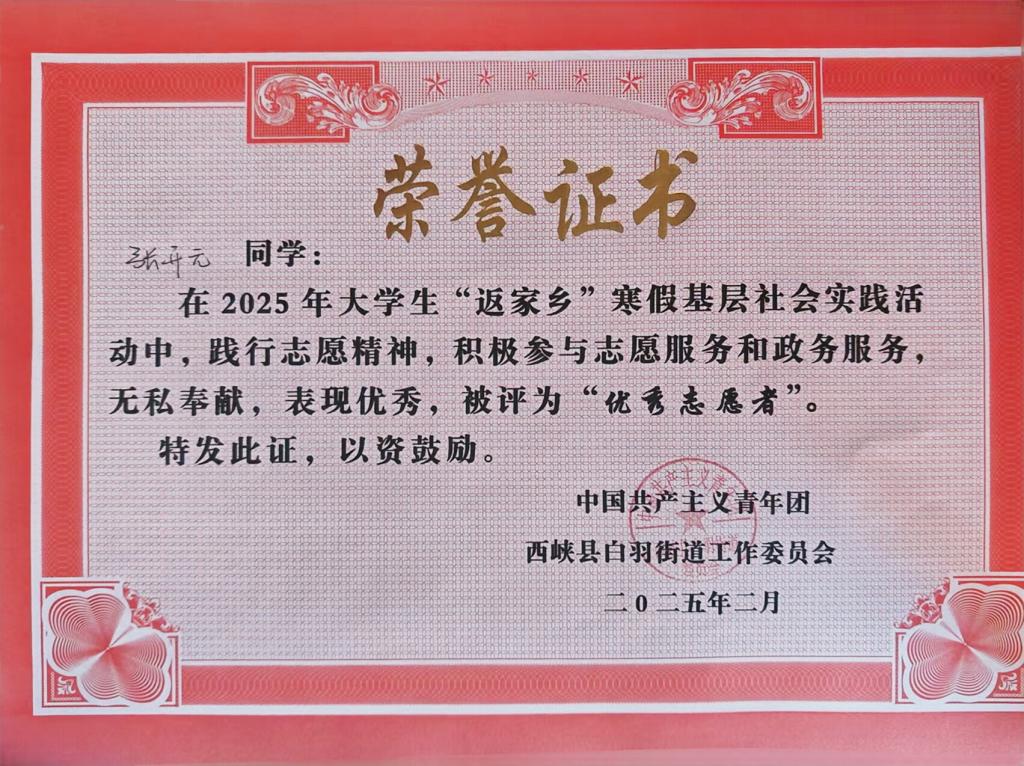 張開元,男,共青團員,金融科技24-2班學生。寒假期間他積極投身西峽縣“返家鄉”社會實踐活動,在西峽縣白羽劉巷社區開展了豐富且充實的志愿服務。